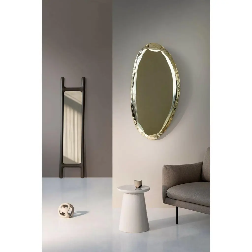 Grey Drab Sculptural Wall Mirror by ZietaDimensions: D 6 x W 46 x H 188 cm.Material: Mirror and carbon steel. Finish: Powder-coated in grey.Also available in different finishes and colors: stainless steel or powder-coated. Please contact us. A DRAB mirror is an object that combines a steel frame with a glass mirror. It is an effect of the experiments with the inflated steel created with the use of FiDU technology that has led Oskar Zieta to create a DRAB hanger and DRAB mirror.DRAB mirror owes its name to its simple form that resembles a ladder (in Polish “drabina”). It is a minimalist object with an elegant framing that can be hung on a wall or leaned against it. In both arrangements, it will add a pinch of elegance to every contemporary interior.DRAB mirror is a geometrical mirror and a decorative object. Contrary to such mirrors from Zieta Collection as RONDO, TAFLA, or OKO, the inflation effect is not so obvious in its case. The deformations of the inflated steel are subtle just as the slender vertical shape of the mirror. The delicate folds are highlighted in the convexity of this simple form.The DRAB mirror can be used as a bedroom or bathroom mirror. It will also serve perfectly as the finishing touch in a modern or classical hallway or corridor. It is a perfect decorative object for private and public spaces such as hotel rooms and SPA parlors.About Zieta: Zietas main goal is to deliver uniqueness and customization in design and construction while keeping the production, transport, and warehousing innovatively efficient.This is how they imagine the future world: Light, durable structures of customized applications produced on demand out of one-of-a-kind parts, yet efficiently.They use a computer-controlled production process. Customized pattern, customized form, customized function, one-of-a-kind product, and outstanding precision are what they deliver.You will find all of this philosophy reflected in the products. They research, they discover new possibilities, they play with forms and they deliver a beautiful, innovative, surprising outcome to people who love the design and who care about design development.They believe their work is a valuable contribution to the world of design not only by the unique beauty of the forms but most of all by opening ultra-innovative opportunities of forming and new paths for the world of the future.