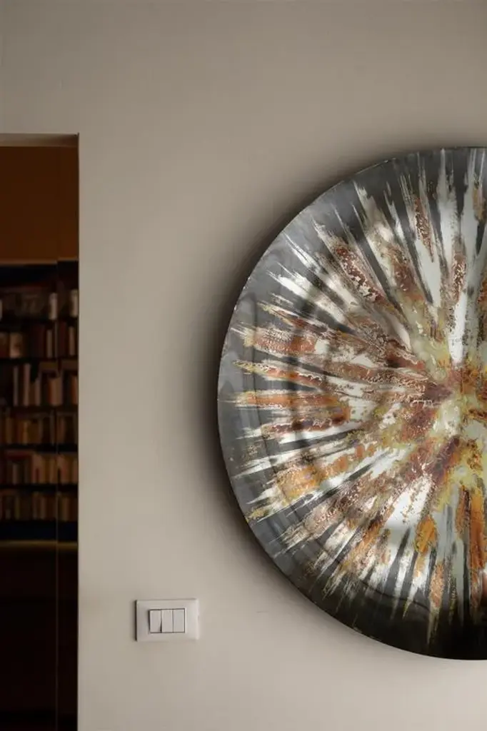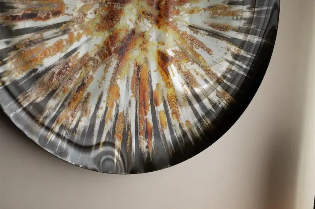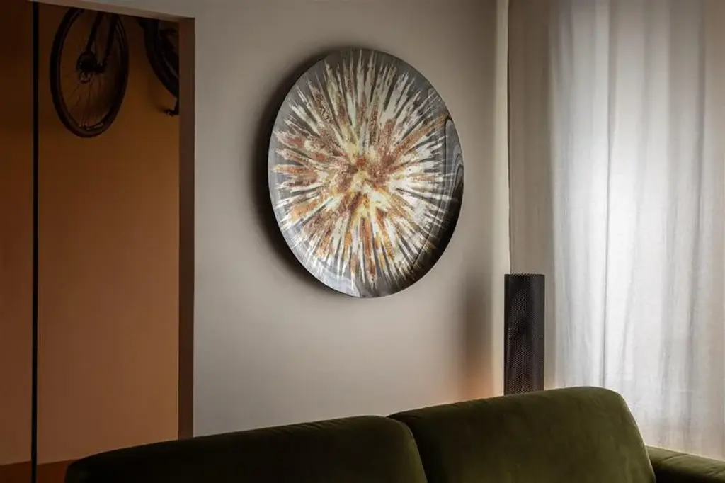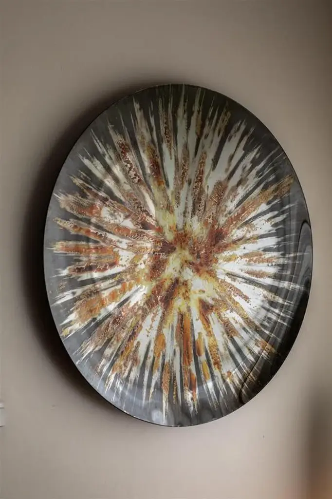 Grey Star Wall Mirror by OOM Contemporary Glass Dimensions: Ø 99 cm. Materials: Lusters and ceramic enamels on grey glass, mixed techniques. Discover the Dome Collection, where glass artistry meets innovative design. This unique series features both plain and hand-painted curved mirrors, masterfully crafted using Murano Glass combined with ceramic enamels and metallic lusters. Drawing inspiration from the dynamic world of contemporary design, the Dome Collection redefines the boundaries of creativity and craftsmanship.