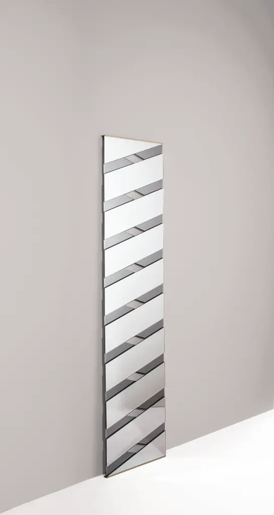 A clear reference to the motif of the weave: the rectangular mirror is a tribute to the men's tailoring, citing the strong diagonal weave, which is achieved by intertwining the threads in order to create a structure oriented at 45 °, which is used to give unpublished reflections in plain fabrics. Labeled by Maker,Labeled by Maker