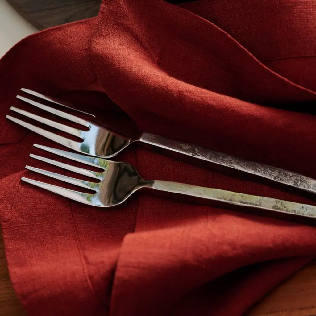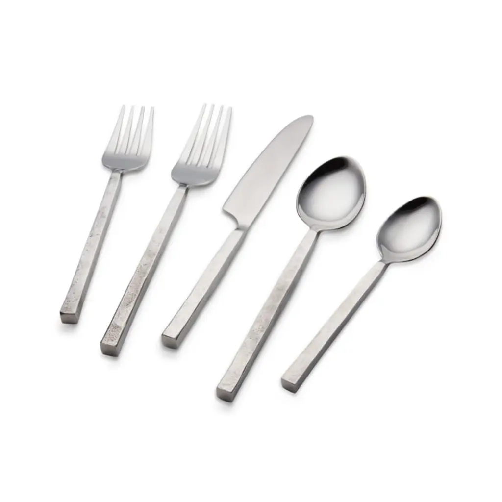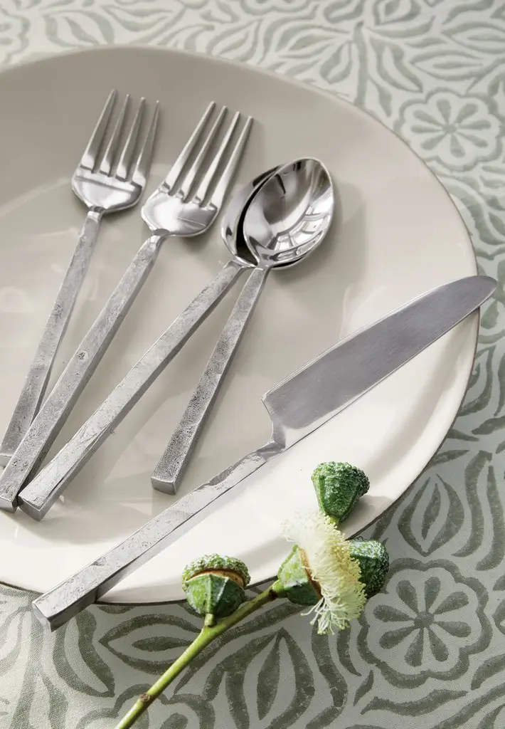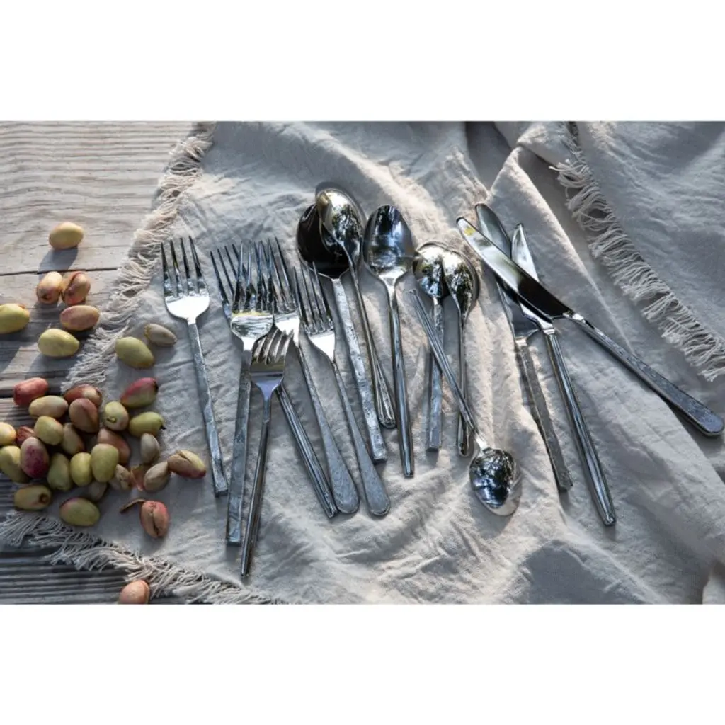 Artisanal hand-forged handles with unique texture and a subtle silver patina contrast with mirror-polished heads for a striking, contemporary flatware collection. Handle finishes on these rustic, organic pieces will vary according to subtle differences in the handcrafted process and natural pitting.
