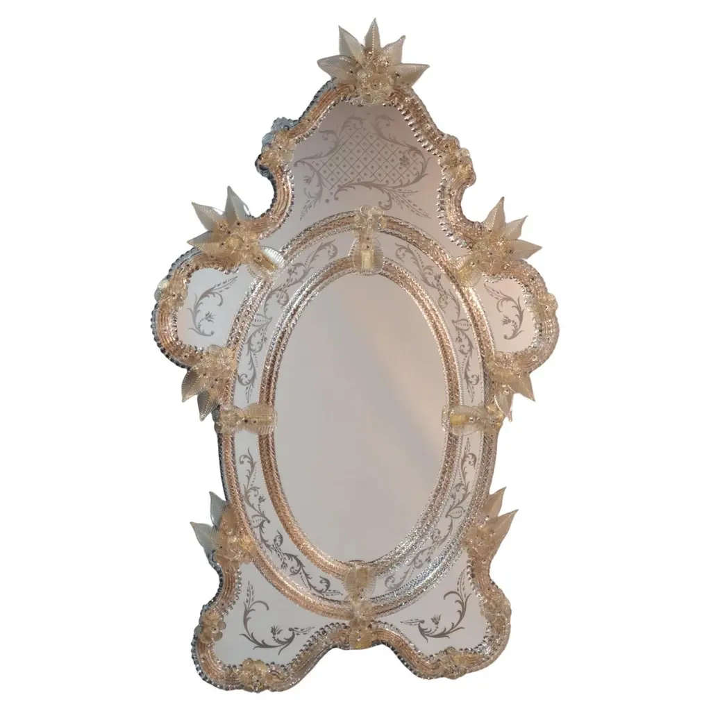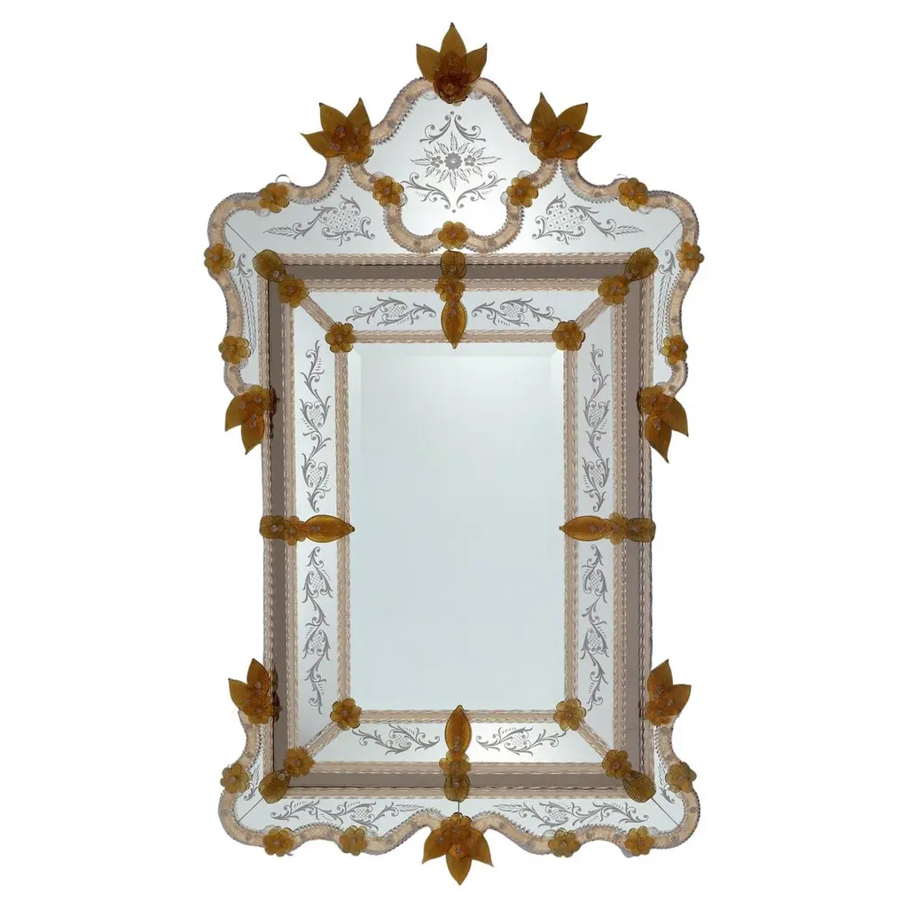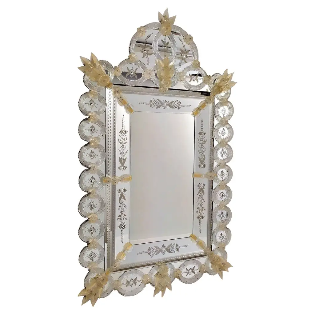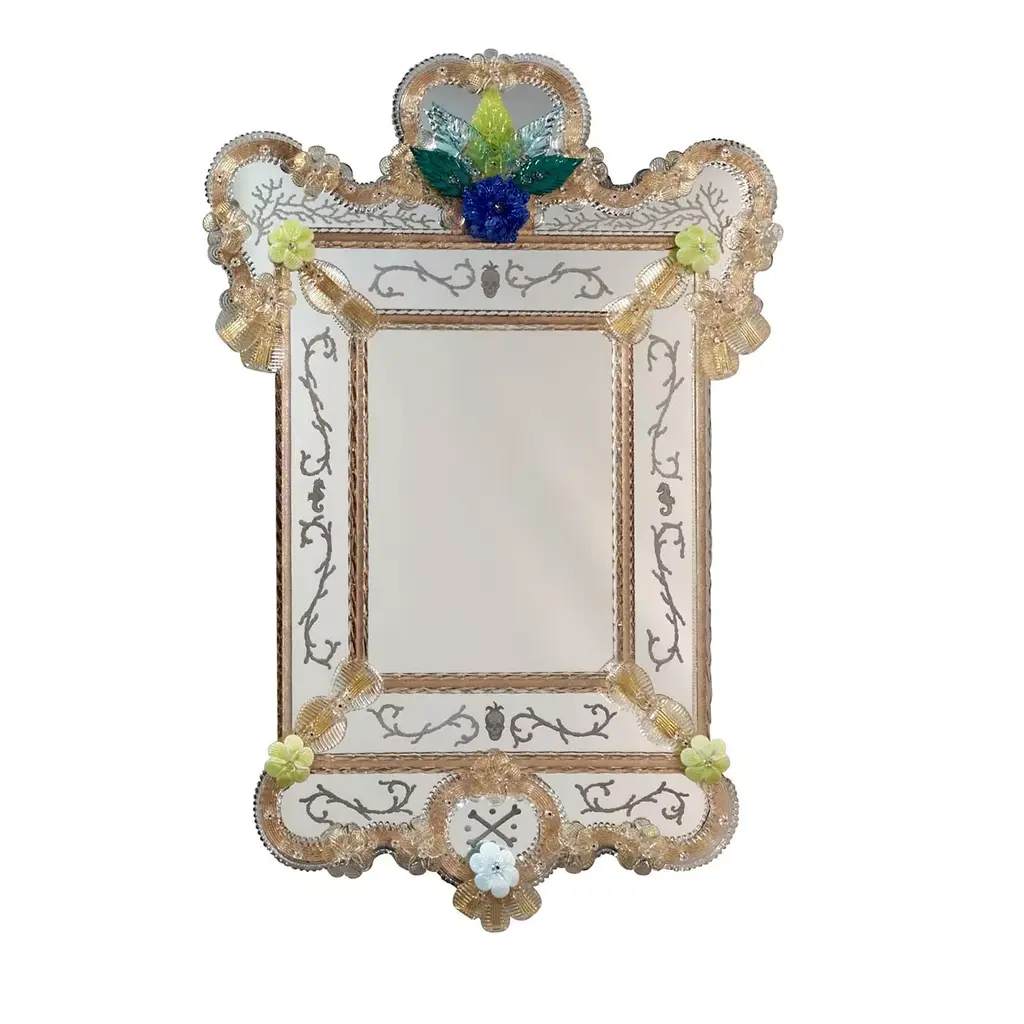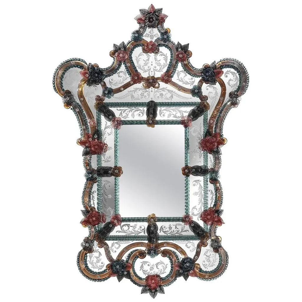 Precious octagonal Venetian mirror, made in the strictest Murano tradition. Finely hand-engraved on the elements of the upper crest and on the bands, it is assembled with numerous floral elements in multicolored crystal handmade in the Murano kilns. Wooden frame with a natural finish. Please contact the Concierge for further information.