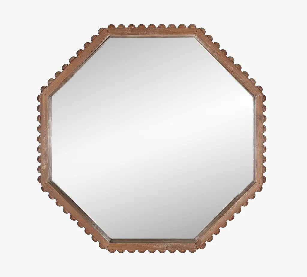 Crafted of pine with a subtle whitewash finish, this eight sided mirror adds a touch of earthy style to your home. The decorative wood bead trim brings eye-catching sophistication at the end of a hallway or as the centerpiece on a mantle.
