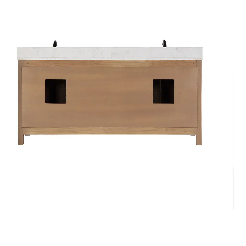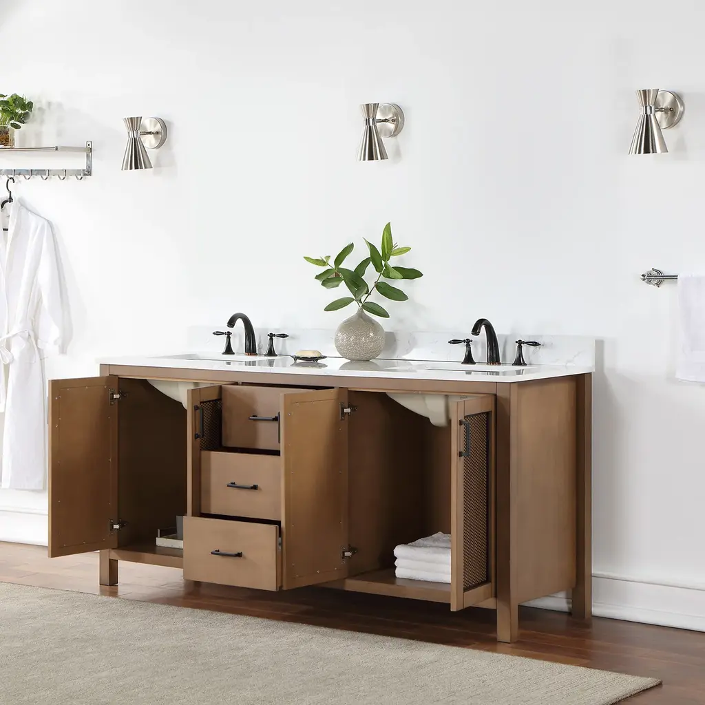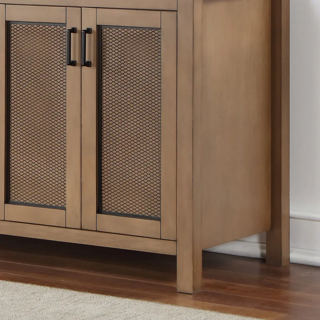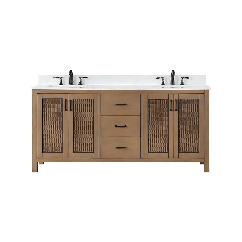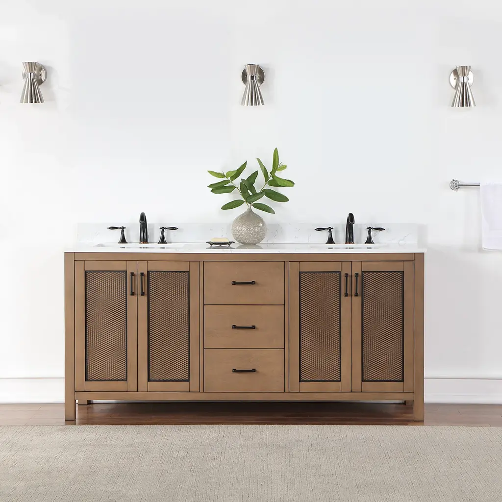 With its compelling blend of wood, metal, and stone, our Hadiya Vanity has an industrial style edge. Metal mesh inserts on the cabinet doors lend a dash of bold texture, concealing spacious storage for stowing away towels, cleaning supplies, and toiletries. Soft-closing drawers provide additional storage flexibility to help keep your space tidy. This sturdy and well-constructed vanity is capped with a beautiful, easy-to-clean composite-stone countertop that provides a stunning parallel with the natural wood grain.Sturdy structure crafted of solid wood and plywoodCabinet comes in Brown Pine finish to enhance your décorElegant composite Carrara White stone countertop with backsplashTwo rectangular, undermount ceramic basin with overflow includedCountertop comes with pre-drilled, 8 in. widespread faucet hole4 inset doors with adjustable, Euro-style, soft-closing hinges for a sleek, seamless appearance, 3 soft-closing drawers with high-quality, full-extension slides to maximize storageAvailable with zinc alloy hardware in Matte Black finishDoes not include mirrorBold industrial style with a rich blend of materialsWooden door panel features unique black-metal mesh materialDoes not include faucet, drain assembly, or P-trapComes fully assembled and ready to install in your bathroom