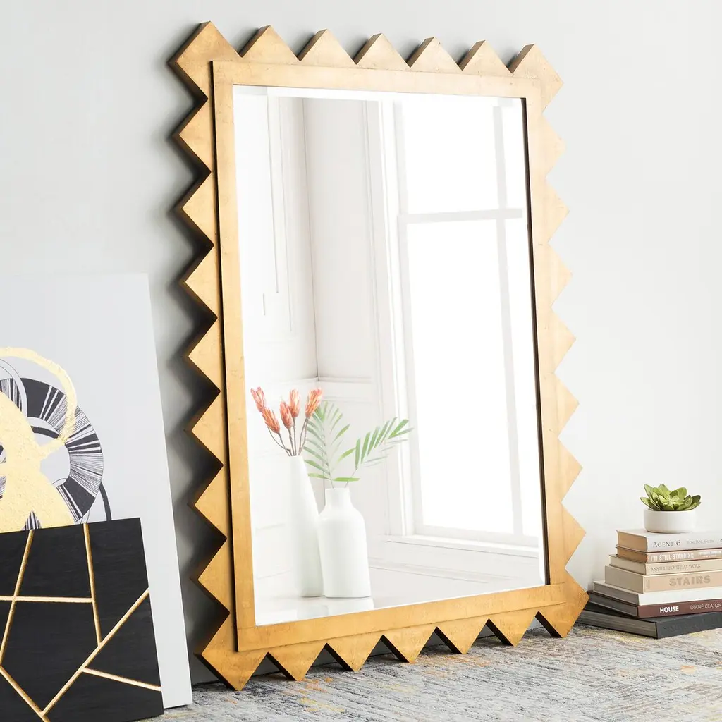 The accent wall mirror is a stunning representation of updated traditional style with sharp lines and a geometric profile . This remarkable piece instantly elevates any room with its elegant design and timeless appeal. It's more than just a mirror; it's an artistic statement that reflects your exquisite taste. Easy to maintain, simply wipe clean with a dry cloth and avoid harsh cleaners to preserve its beautiful finish. Enhance your home decor with this mesmerizing accent piece that seamlessly combines functionality and style. Can hang vertically or horizontally or lean against a wall.