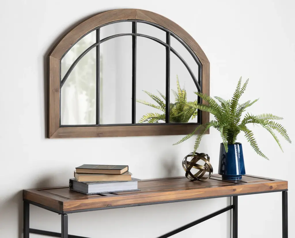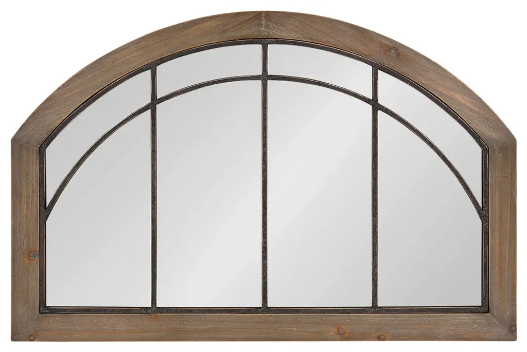 The Haldron Wood Arch Mirror embodies the casual feel of a timeless aesthetic. Our version of this traditional style mirror includes a decorative natural iron fretwork and a wide wood profile finished in a rustic brown. Meant to be hung horizontally, it will provide radiance while balancing a room�s ambiance. The mirror''s internal metal fretwork is an impressive detail inspired by a classical window design. It features a textured rustic finish that adds a dramatic touch to the interior metal design and mirror underneath. This decorative piece is a great addition to your traditional and themed rooms. It comes with metal D-ring hangers attached to the back for easy wall mounting. This wall mirror is ideal for above a sofa, over a mantle, or any wall space that needs brightening and interest. In entryways, bedrooms, or hallways this arched mirror will create a stunning reflective window wall. The outer display dimensions are 36 inches across by 24 inches high. Give your living spaces a visual makeover while illuminating the area with this beautiful arch mirror. • You will love how much light and beauty this mirror pulls into a room; you''ll love the traditional, rustic finish and you''ll love the quality!• The large wooden arched frame is made to hang horizontally for a window-like look that will add an aesthetic to your decor that pops with character and reflection. The overall size is 36 x 24-inches• The Haldron Arch Mirror frame is constructed of solid wood, and the inner fretwork is crafted of an authentic iron metal with a natural finish while the mirrored glass is of a high standard resulting in a beautifully well-built accent mirror• Hang this window inspired wall decor above your fireplace mantel or hang it over your favorite piece of furniture as it will take center stage in any room of your home, creating a stunning focal point• Mirror arrives assembled ready for use with D-ring hangers attached on back for easy wall display. Clean with a soft, dry cloth for best care