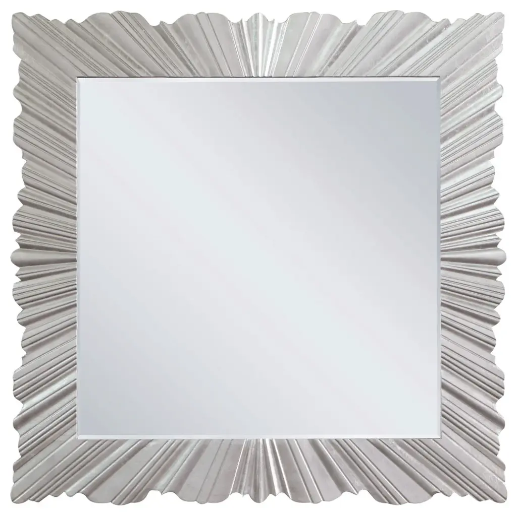 Make this Silverton mirror a reflection of your exquisite taste. Eye-catching from all angles, this luxe mirror features a silver leaf finish for a wow-inducing display above the available matching buffet or anywhere you choose to display it. Intricate hand-carved details around the frame of the mirror give it a starburst look, and it''s made from wood, so it''s durable and made to last and last. Add this contemporary mirror to your decor for an heirloom look that gets your wall noticed.Overall Product Dimensions: 42" W x 1.5" D x 42" HSilver Leaf FinishIntricate Hand Carved Starburst LookContemporary Design