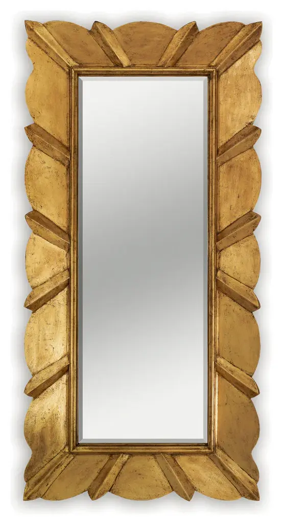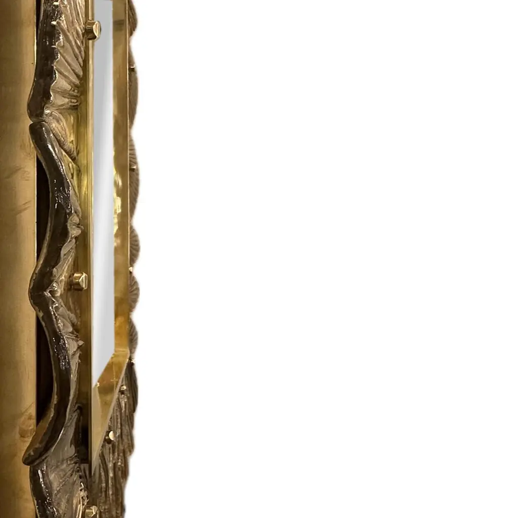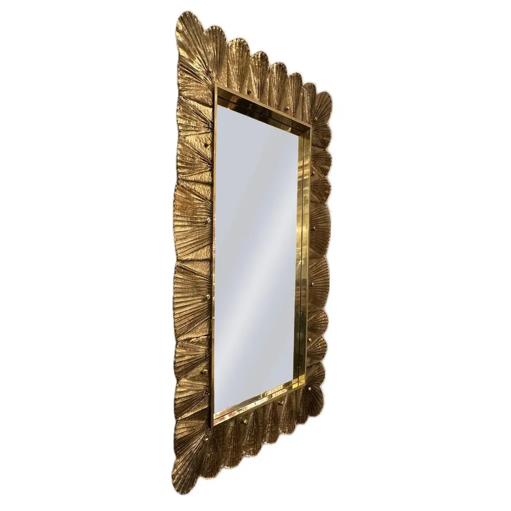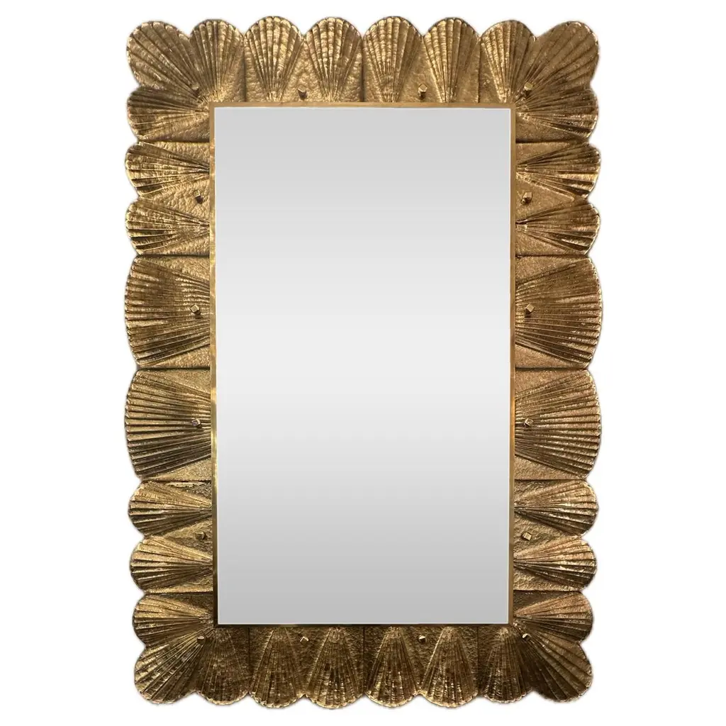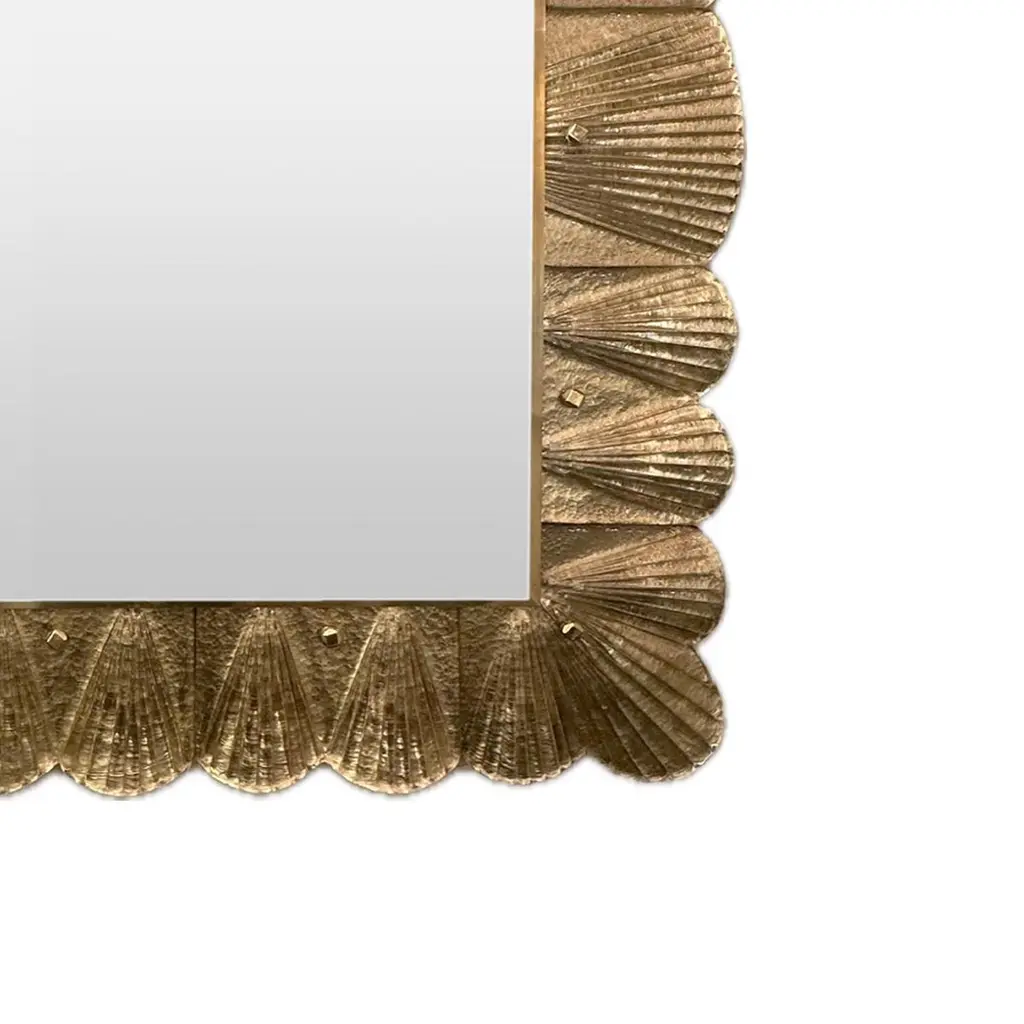This elegant mirror features hand made tiles of clear Murano glass over gold leaf, that creates an elegant and luminous display. The distinctive scallop shell motif brings a touch of the Art Deco Style that elevates every space it reflects.