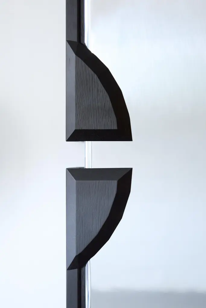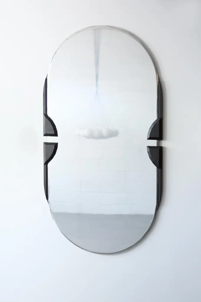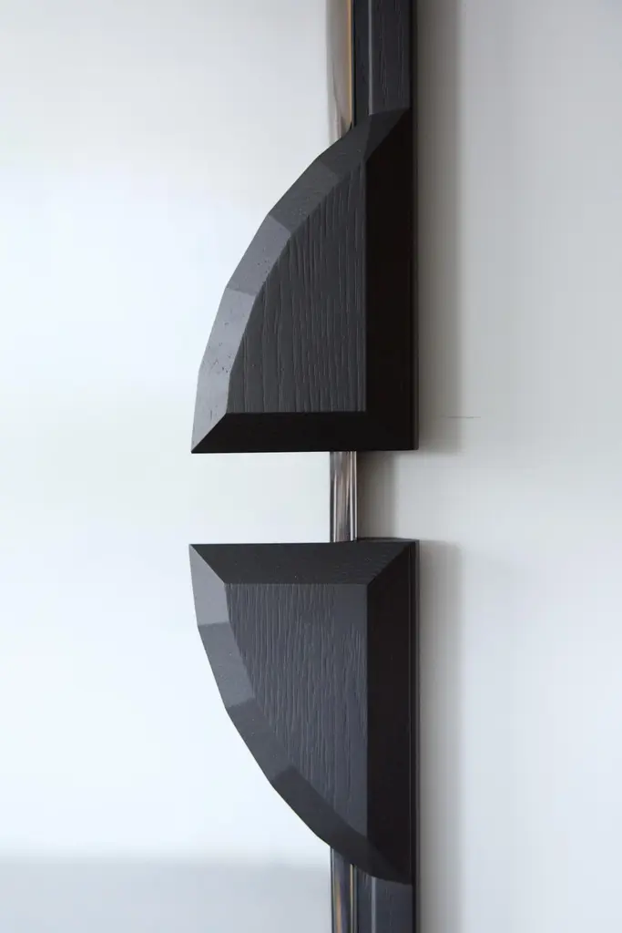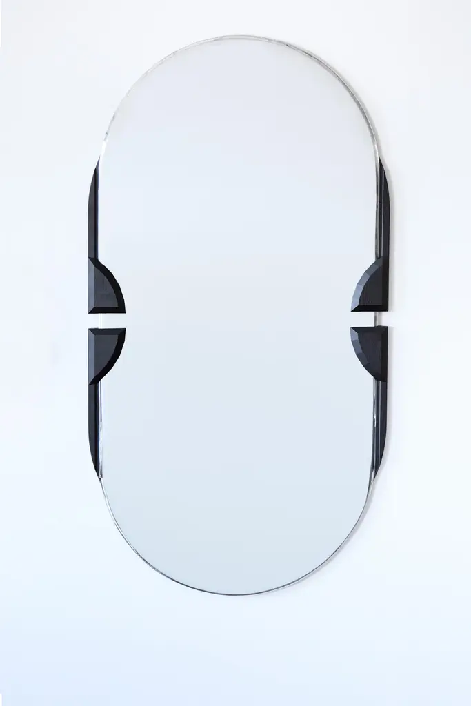 The studio admires the way a mirror can transform a space. Part functional design piece, part art piece, mirrors have the opportunity to bridge the worlds of art and design — the Barrow Mirror looks to do just that. This wall-mounted mirror offers the viewer a new and different way to experience the barrow design language. In reference to the distinctive angled cut synonymous with the collection, four faceted panels clutch the mirrored surface, facing the viewer head-on. This piece plays with Barrow’s angled details in a new way, allowing the viewer to experience the collection's design language from a different, face-to-face perspective.The mirror itself is fabricated from hand-polished aluminum. This unusual material further blurs the line between art and design adding interest, texture, the evidence of handiwork, and an unexpected hue to the work's surface.As all of our work is handcrafted and made to order, we do not accept returns. Our standard finishes for this mirror as pictured are Handpolished Aluminum and Blackened Oak. Customizations are available with regards to wood & mirror finish and sizing. Standard glass mirror finish is available as a custom option. Please inquire within for custom pricing and additional details.