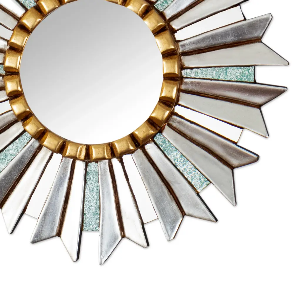Inspired by the moon, Peruvian artisan Marcos Luzalde handcrafts a wood wall mirror embellished with precious metals. Perfect for adding a magical aura to your environment, this piece of art features a geometric design enhanced by aluminum and bronze leaf accents that surround the centered glass, all polished for a shiny look.