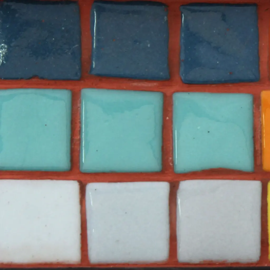 Working in ceramic mosaic, Lalit Sakhuja unites bright colors in a design of happy harmony. The designs frame a bright, contemporary wall mirror.