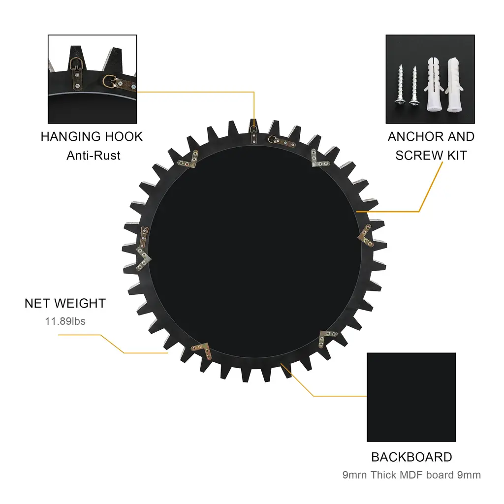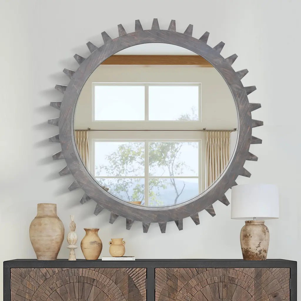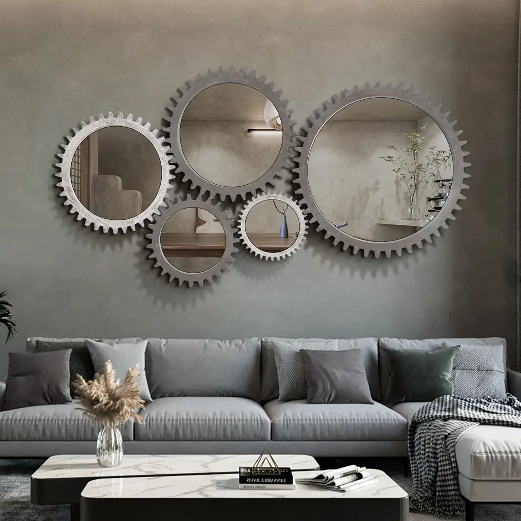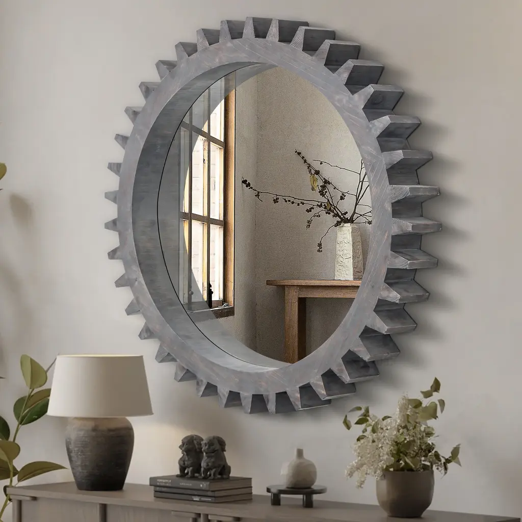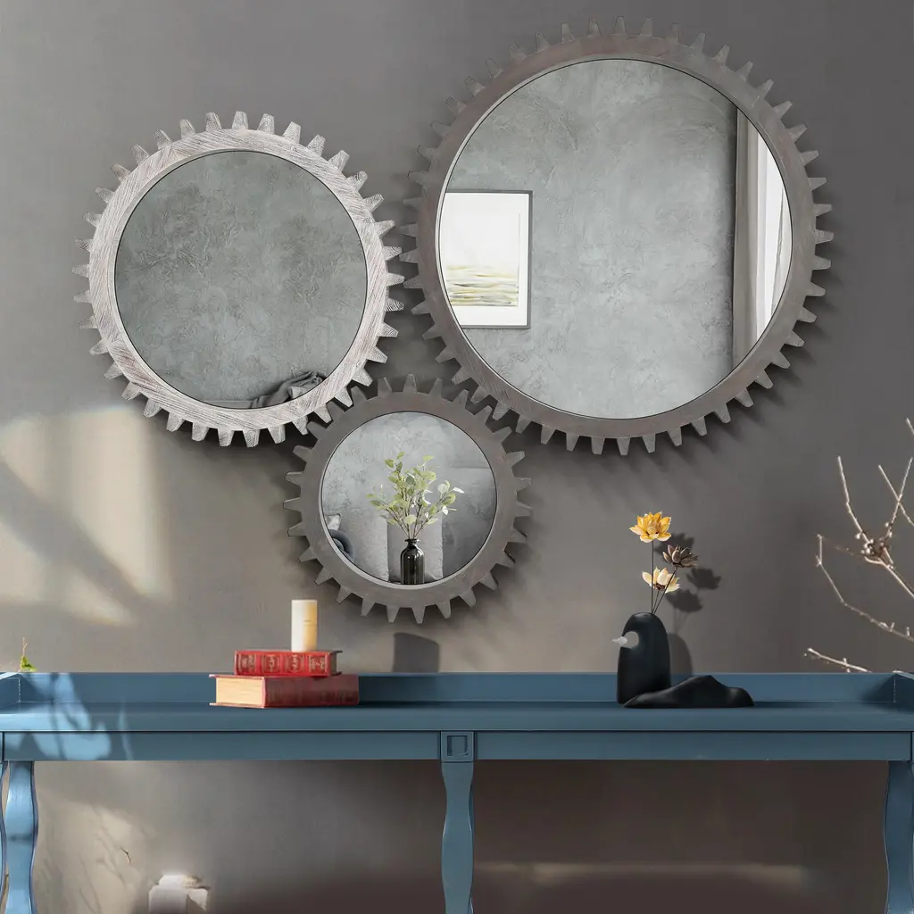Elevate your space with this retro-inspired gear-shaped mirror, featuring a unique design that adds character and charm. Crafted with a heavy wooden frame and a high-definition round mirror, it offers both durability and visual appeal. Available in multiple sizes, the mirrors can be combined seamlessly to create custom shapes that suit your style. Perfect for various locations, it enhances corridors, staircases, living rooms, bathrooms, and more. This decorative mirror brings a distinctive touch while serving as a functional and stylish addition to your home.
