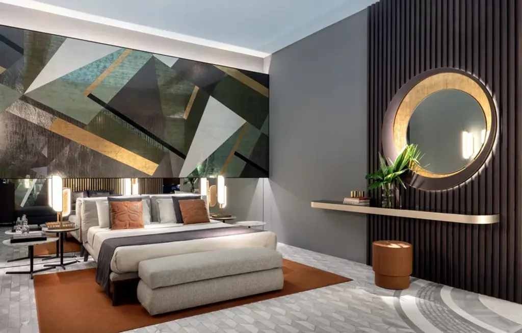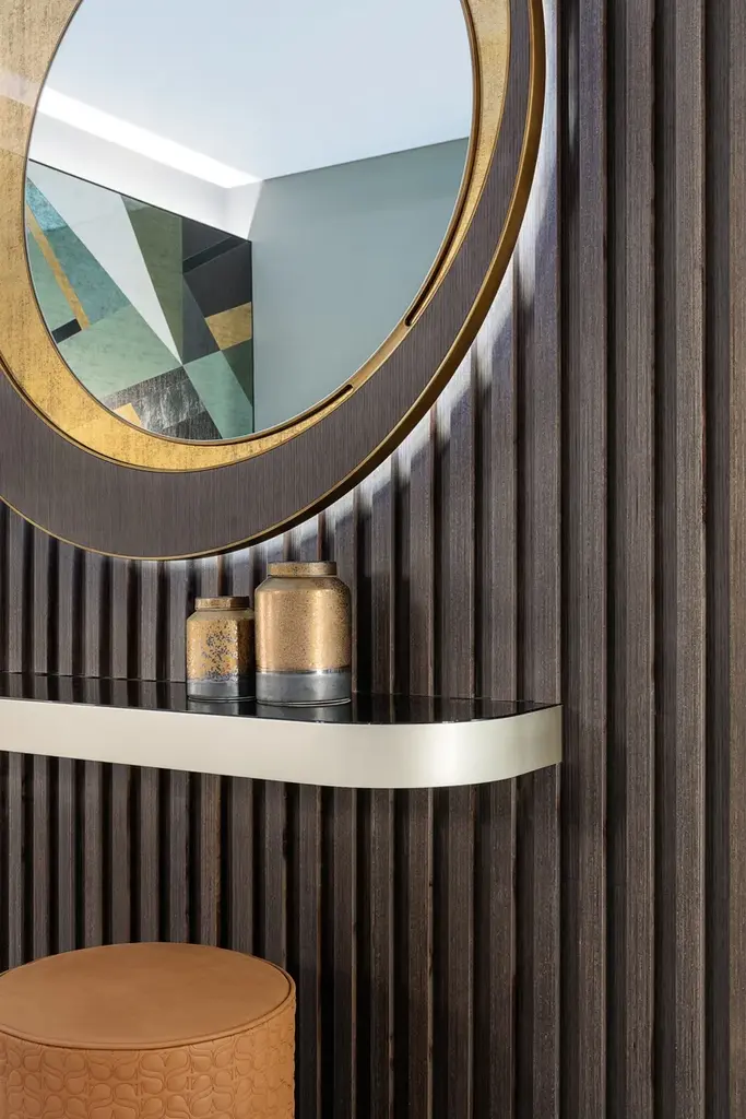 Harper is a mirror with wooden structure, Ammara ebony finishes, and edges in coated lacquer finish; decorative strip in foam glass and central mirror.The game of shapes and materials that distinguishes this mirror makes it look like moon sections. The backlit LED completes this evocative effect.