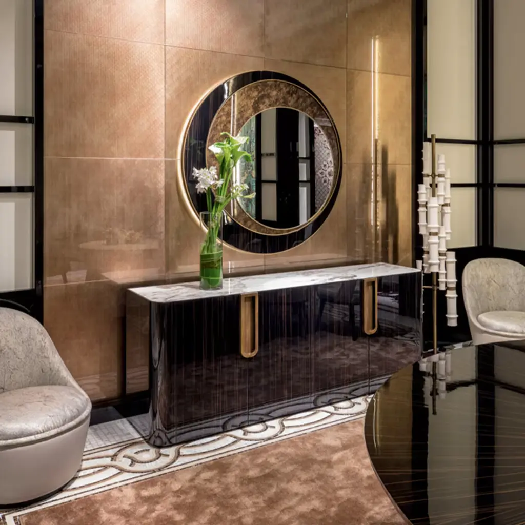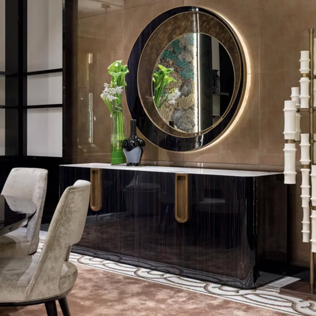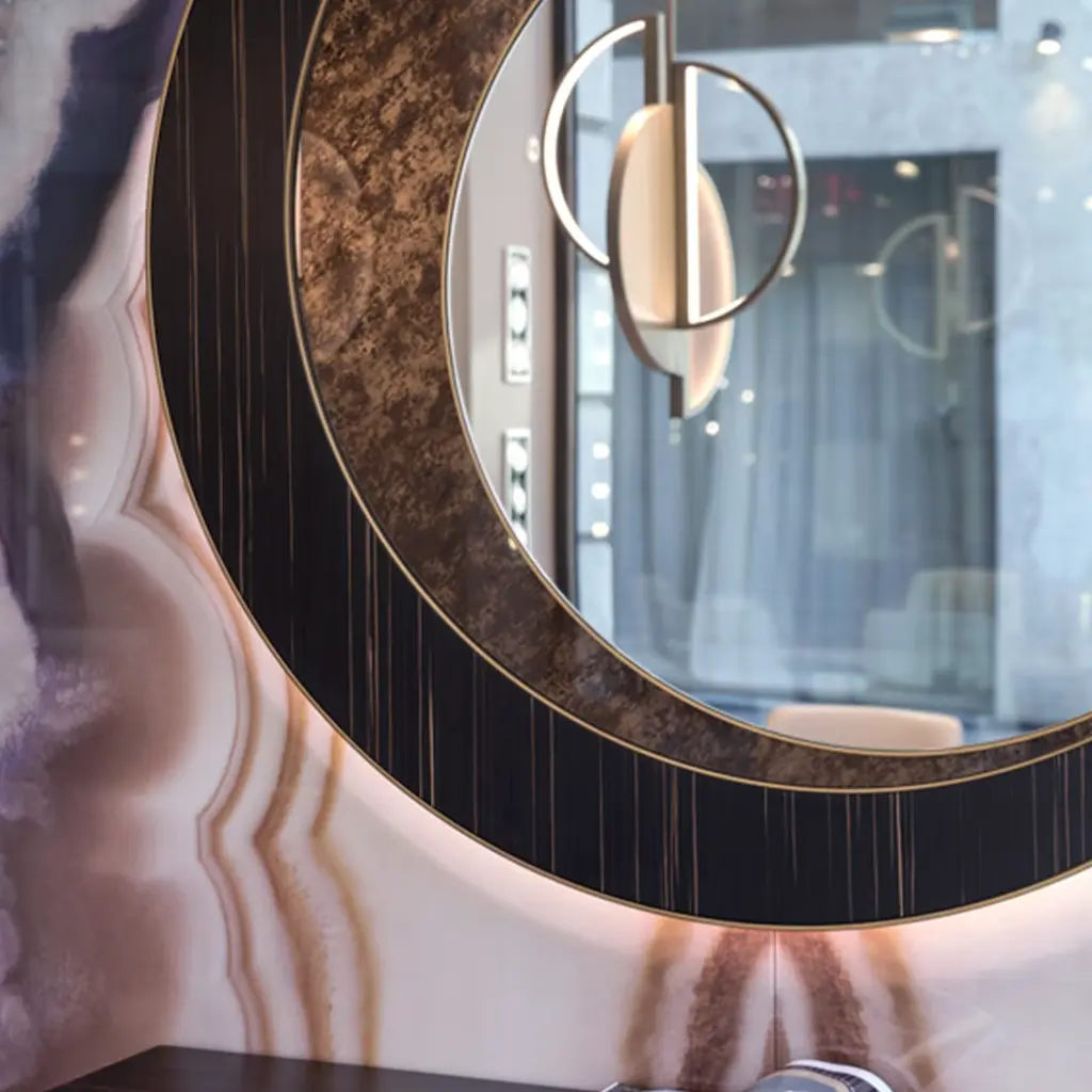 The game of shapes and materials that distinguishes this mirror makes it look like moon sections. The backlit LED completes this evocative effect.