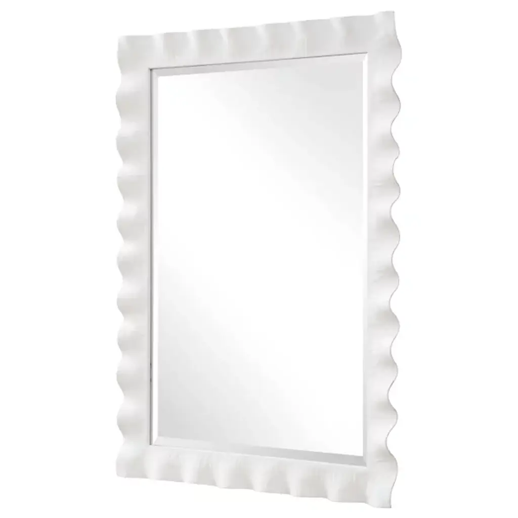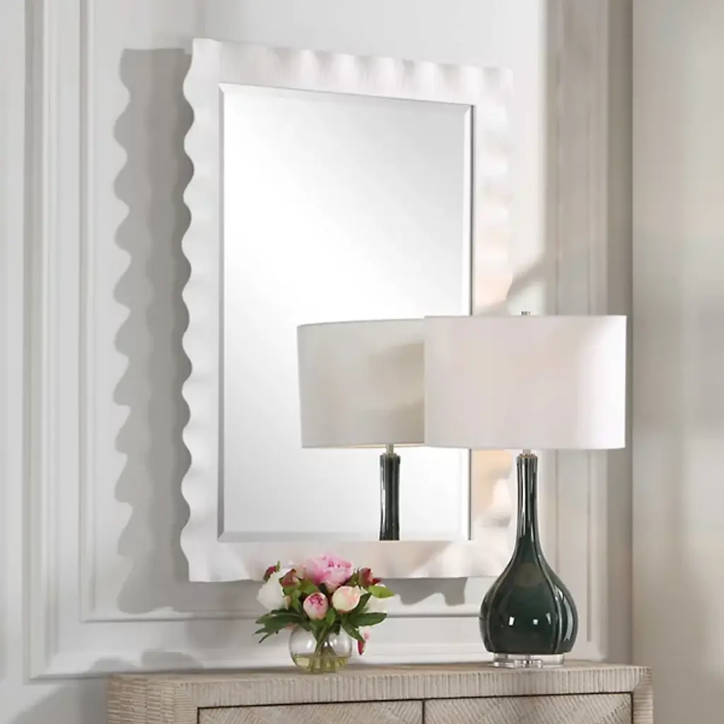 The Haya Mirror from Uttermost, designed by Grace Feyock, introduces an organic rhythm through its hand-forged metal frame. Each scalloped edge creates a gentle wave pattern that moves around the mirror's perimeter. The semi-gloss finish brightens spaces while maintaining the frame's artistic character. The generous beveled edge adds refinement to the overall composition. This adaptable piece works equally well in horizontal or vertical orientations, bringing movement and vitality to walls while maintaining everyday utility.