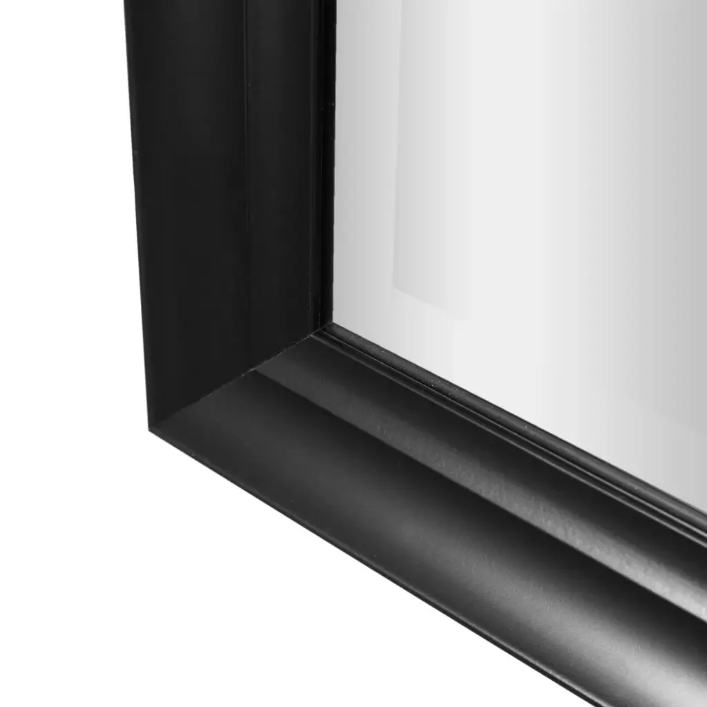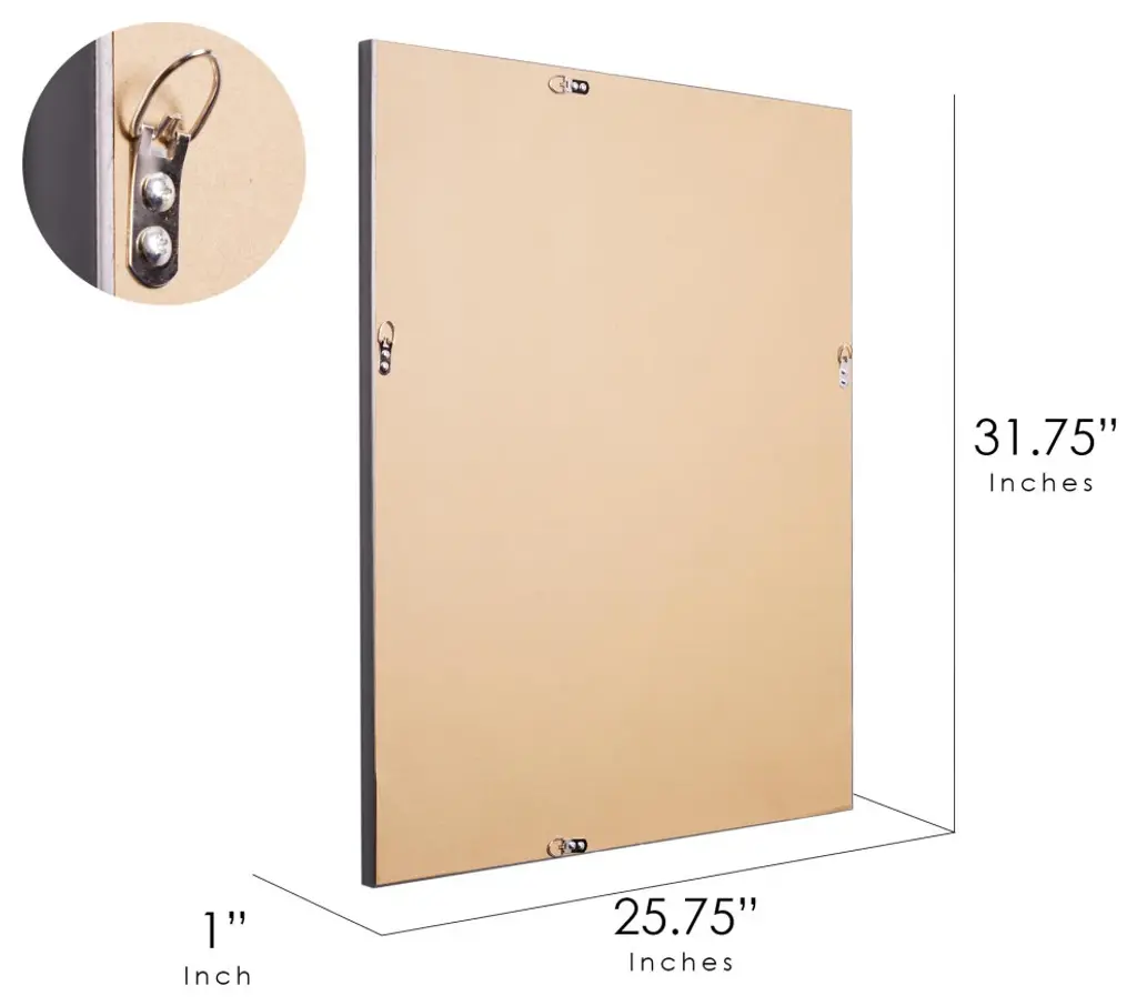 Mirrors are essential for dispersing light, as they concurrently add visual height and width to a space. Add a timeless piece like our rectangular frame mirror to add warmth and comfort to your living room decor or pair it with a decorative wood end table and runner rug in an entryway. This mirror is versatile enough to keep in a bathroom or home office to catch a quick glimpse before your early morning video conference call.PRODUCT SPECS:Overall Dimensions: 25.75" W x 31.75" H x 1" DMirror Dimensions: 21.5" W x 27.75" HFrame Width: 2"Product Weight: 10.1 lbs FEATURES/BENEFITS:TRADITIONAL DECORATIVE APPEAL - Expand your decorative repertoire with this contemporary classic framed beveled mirror in black skillfully crafted with attention to detail. VISUALLY INCREASE THE SIZE OF YOUR SPACE - Hang our decorative rectangular frame wall mirror adjacent to a window or light source, and you''ll realize you don''t need a lot of space to feel like you have a lot of space.BEVELED EDGE MIRROR - Beveled edge mirrors, usually heavier in weight, add sophisticated elegance to a space by exhibiting a rainbow effect reflection when capturing light.VERSATILE STYLING - Whether a lavishly decorated living room, eclectic bohemian bedroom, or rustic farmhouse dining room, you''ll see how easy it is to style this rectangular mirror with a black frame vertically or horizontally.EASY TO HANG - Equipped with 4 d-rings on the back of the mirror for a secure balanced hang. Nails not included.