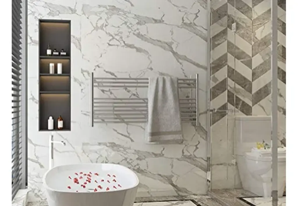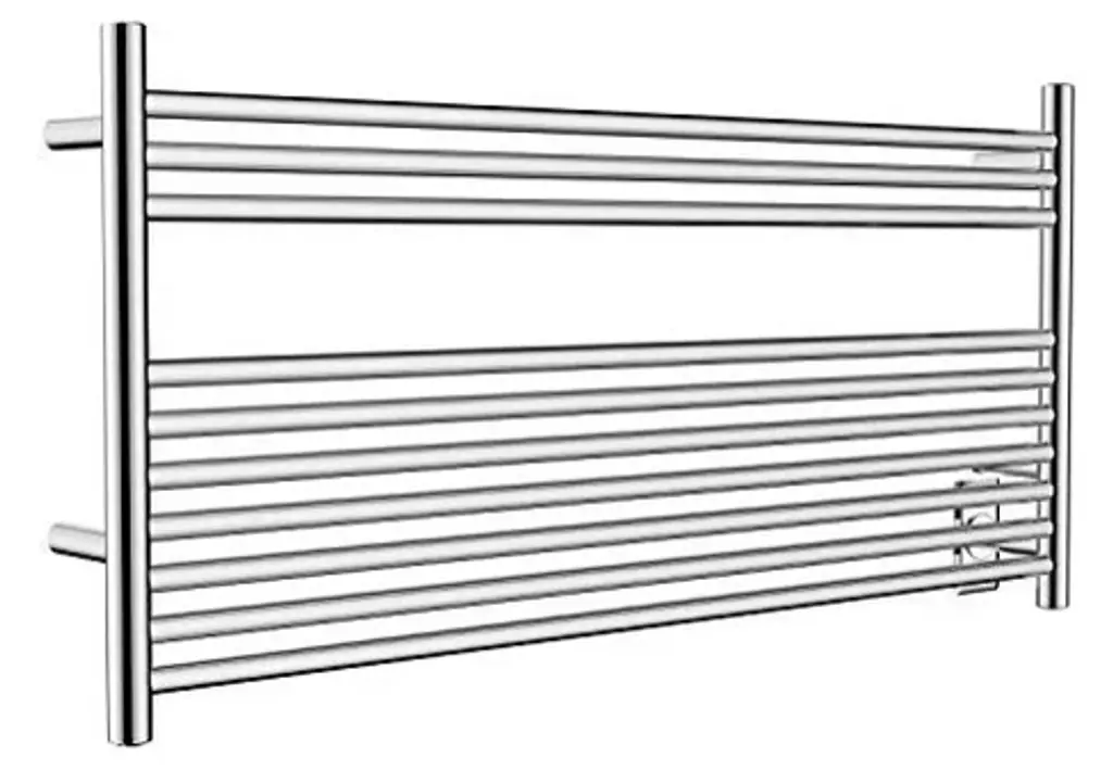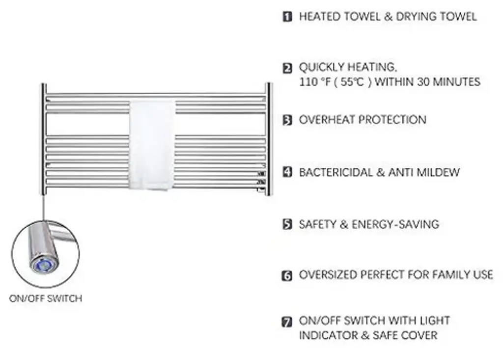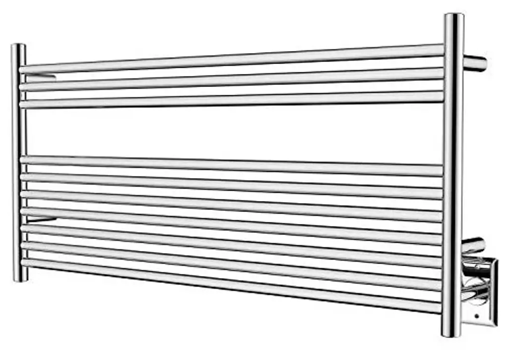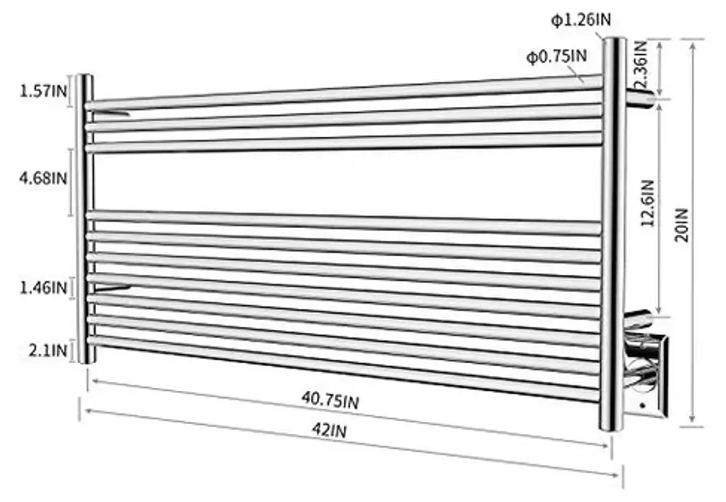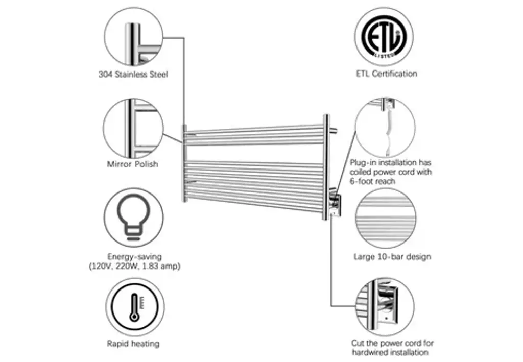 SpecificationsItem model number: R64154Material: Stainless steel 304Bar configuration: 10 Straight BarStyle: Wall MountedWiring options: Hard- wiring/ Plug in ( Please note: The hard-wiring should be carried out by a trained electrician.)Rated voltage: AC 120V/60HzElement Power (W): 220WFinish: Brush Polished/Mirror Polished/Matt BlackRail tube Ø (inches): 0.75Dimensions (H x W inches): 20 x 42Weight: 15.7 lbsPacking list: 1 x Heated towel warmer, 1 x user manualProduct OverviewThe HEATGENE R64154 series (Finish & colour options: Mirror polished/ Black/ Brushed) is as functional as is it beautiful.Its efficient multiple rails offer plentiful towel hanging capacity and high heat output.It is handcrafted from the highest quality stainless steel.This model adds a premium look to our popular warmers.FeaturesOversized design: This towel warmer is made of 304 stainless steel, easy to clean, and has excellent rust & corrosion resistance. It was designed with groups of bars to increase heat density with a larger heated area to meet the needs of the whole family.Energy-efficient: Rated power 220W, only 15 minutes, it can be heated to 110 F, 30 minutes to reach the optimal working temperature 130 F (based on room temperature 68 F), and maintain a constant temperature, a warm towel ready for you at anytime.Easy installation: This space-saving wall-mounted towel warmer offers two ways of wiring (hardwired/plug-in). Whether you have a new bathroom or are retrofitting one, our warmers combine practicality & decoration, you should not miss out.Reliable quality: An ETL-certified towel warmer with a constant temperature of 130 F, which not only inhibits bacterial growth, but also provides warm towels at all times. Overheat protection ensures safety from excessive temperature.2-year manufacturer's warranty. Please feel free to contact us with any issues.
