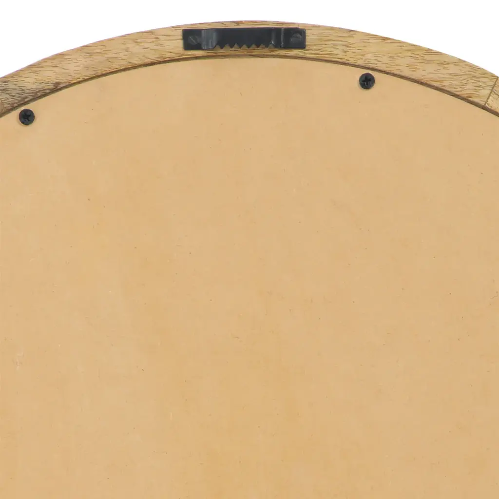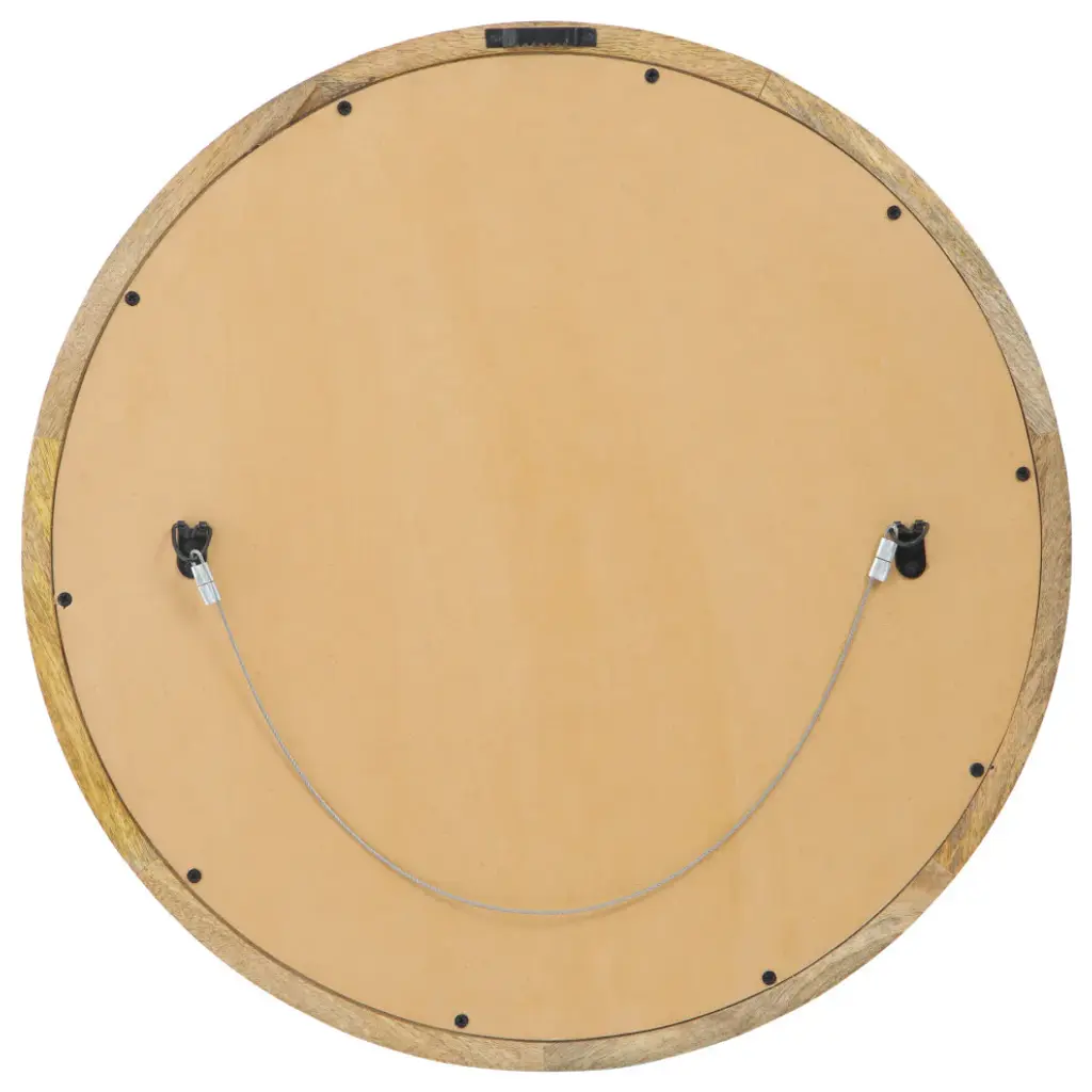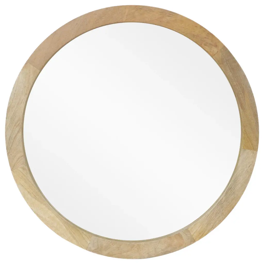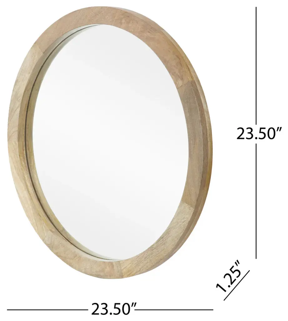 Place our circular mirror tactfully and stylishly on your walls to maximize light and open up any room or hallway with a charming accent. Bordered by a simple wood trim and sleek natural finish, our wall mirror is a must-have for any room. Its reflective surface will not only brighten your room but will also emphasize your existing furniture in all the best ways. This dazzling mirror is made with high-quality craftsmanship from incredibly durable materials, making this the perfect addition to any room of your home. MODERN: Our mirror features a modern style due to its simple yet eye-catching circular design. With its minimalistic wooden border, this accessory provides an understated upgrade to any room. HANDCRAFTED DESIGN: This accessory is expertly designed and handcrafted with artisan expertise. Any natural variations are not product flaws, but rather, will ensure that your purchase is truly a one-of-a-kind product.MANGO WOOD FRAME: Mango wood features gorgeous golden browns with natural hues that come from spalting, making each piece a one-of-a-kind color. Not only does this hardwood showcase unique patterns and take well to stains, but it also offers dense durability to resist wear and tear.DIMENSIONS: Choose an accessory that is the perfect size for you and your furniture. This mirror is 23.50" W x 1.25" D x 23.50" H. You will love how much your space can transform with the simple addition of this wall mirror. NO ASSEMBLY: This mirror comes ready to use straight out of the box. No assembly required.Includes: One (1) MirrorMaterial: Tempered GlassFrame Material: Mango WoodHand-Crafted DetailsNo Assembly RequiredDimensions: 1.25 inches deep x 23.50 inches wide x 23.50 inches high