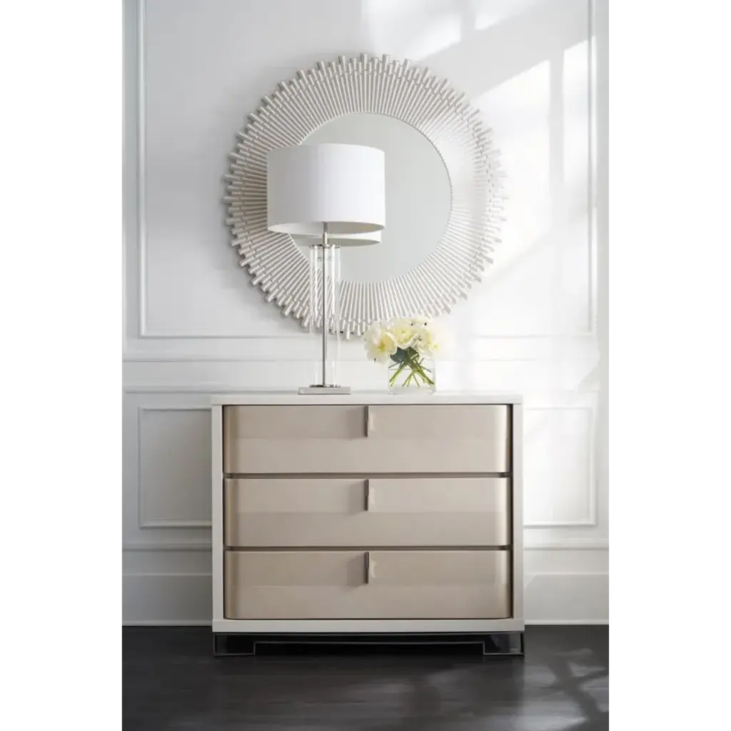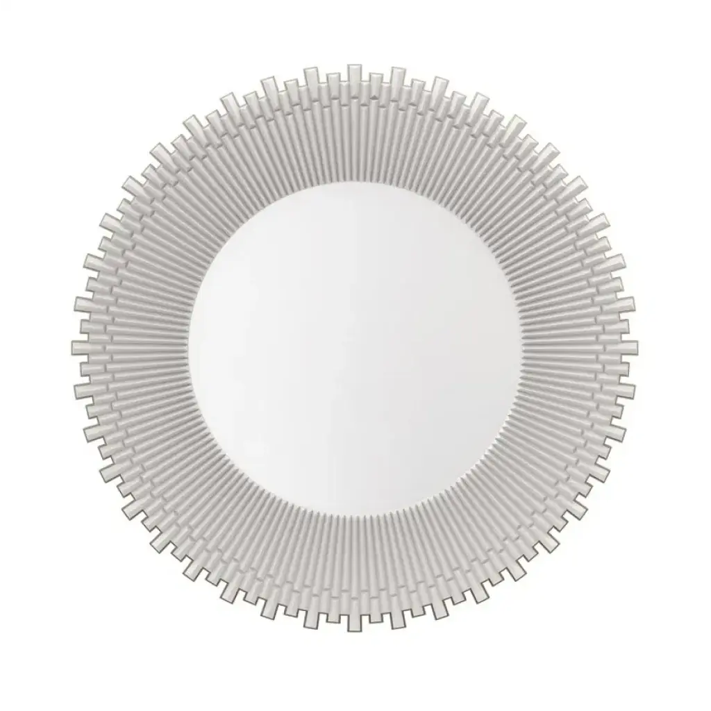 Named for the Greek god and personification of the Sun, this circular mirror radiates with triangular-shaped rays in a creamy Almond Milk finish. Intricately crafted with a crenulated detail around the edges, it adds depth and dimension to moments of reflection. Well-scaled to hang above a dresser or credenza to make a dazzling entrance.