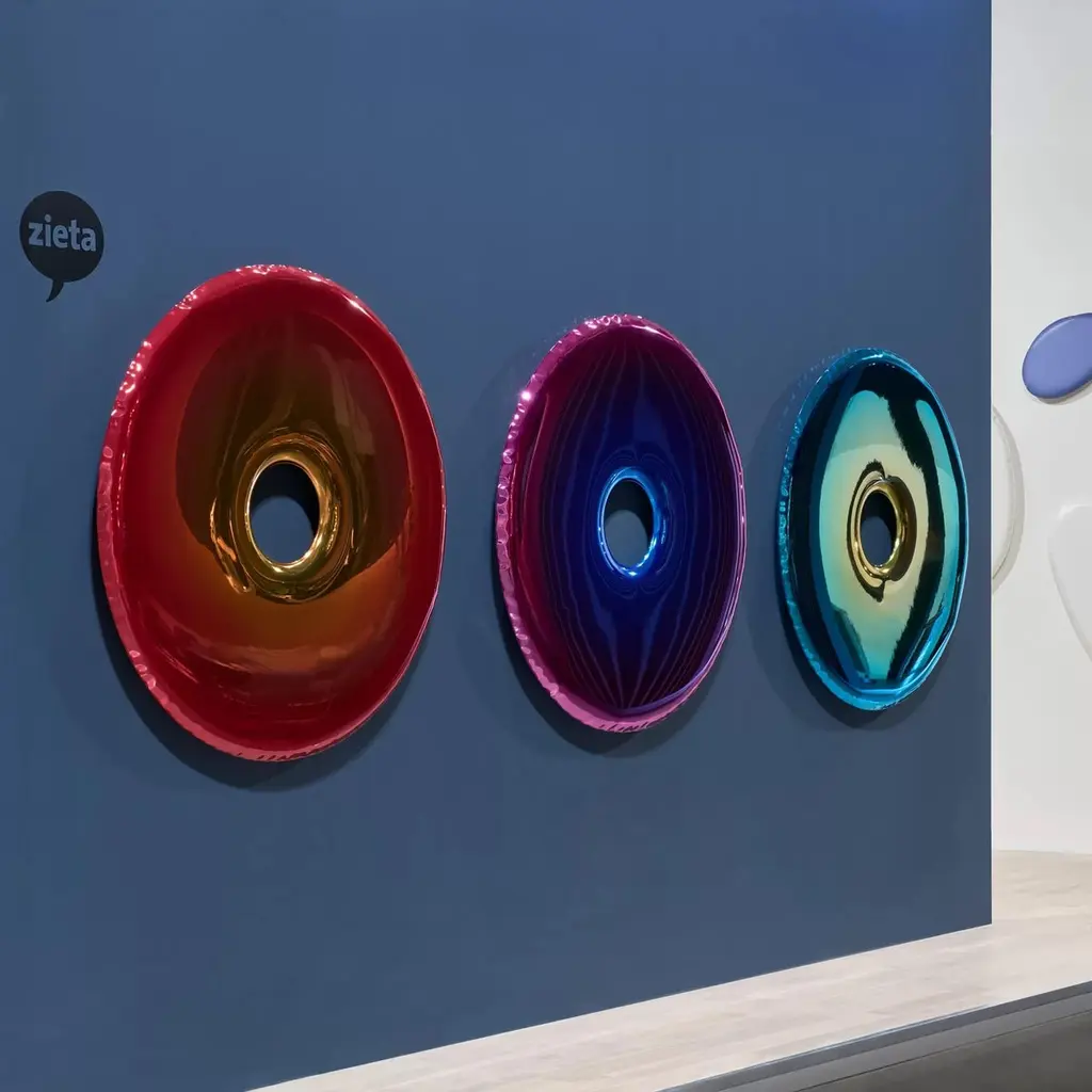Helix Nebula Topaz Rhodonite Rondo 95 Sculptural Wall Mirror by ZietaDimensions: ø 95 x D 6 cm. Materials: Stainless steel. Finish: Helix Nebula Topaz Rhodonite transition. Available in different finishes. Also available in different sizes: ø 75, ø 120 and, ø 150 cm. Please contact us.The Rondo Mirror is made of stainless steel polished to a high gloss. Its polished surface is perfectly reflecting the light and other objects placed in the same room or hall. Largescale convexities that appear on the surface of the mirror are literally able to alter the space. It is like making an individualized interior design of the moment when by rolling the mirror from one place to another everybody can create or rediscover a well-known environment to a brand new and grasping concept. Depending on Rondo´s arrangement, either by hanging it or leaning at the wall, the mirror can change the perception of the surroundings.Deep, dark, blue, and intriguing. The new unique finish of Rondo Deep Space Blue takes the spectators for an unexpected journey into an undiscovered world of reflections. The mirror resembles cosmic wonders and at the same time can be fitted with the most demanding and elegant interiors. Color gives meaning and brings associations. The Gradient collection presents the whole spectrum of shades of cool sea depth. Carefully selected colors blend well with the hard steel.About Zieta: Zietas main goal is to deliver uniqueness and customization in design and construction while keeping the production, transport, and warehousing innovatively efficient.This is how they imagine the future world: Light, durable structures of customized applications produced on demand out of one-of-a-kind parts, yet efficiently.They use a computer-controlled production process. Customized pattern, customized form, customized function, one-of-a-kind product, and outstanding precision are what they deliver.You will find all of this philosophy reflected in the products. They research, they discover new possibilities, they play with forms and they deliver a beautiful, innovative, surprising outcome to people who love the design and who care about design development.They believe their work is a valuable contribution to the world of design not only by the unique beauty of the forms but most of all by opening ultra-innovative opportunities of forming and new paths for the world of the future.