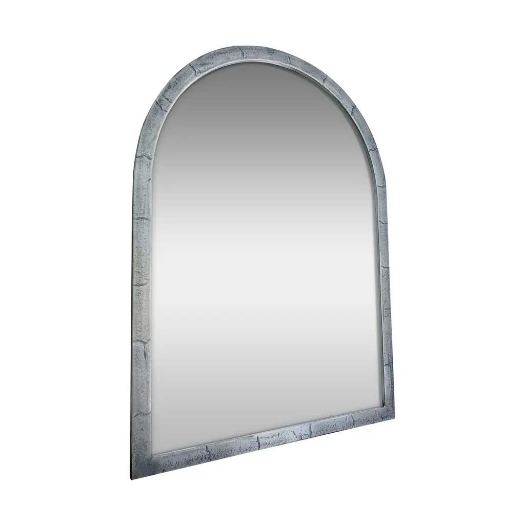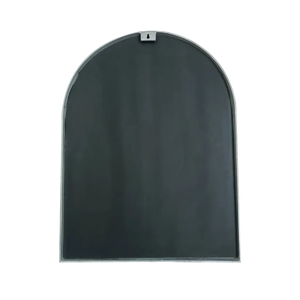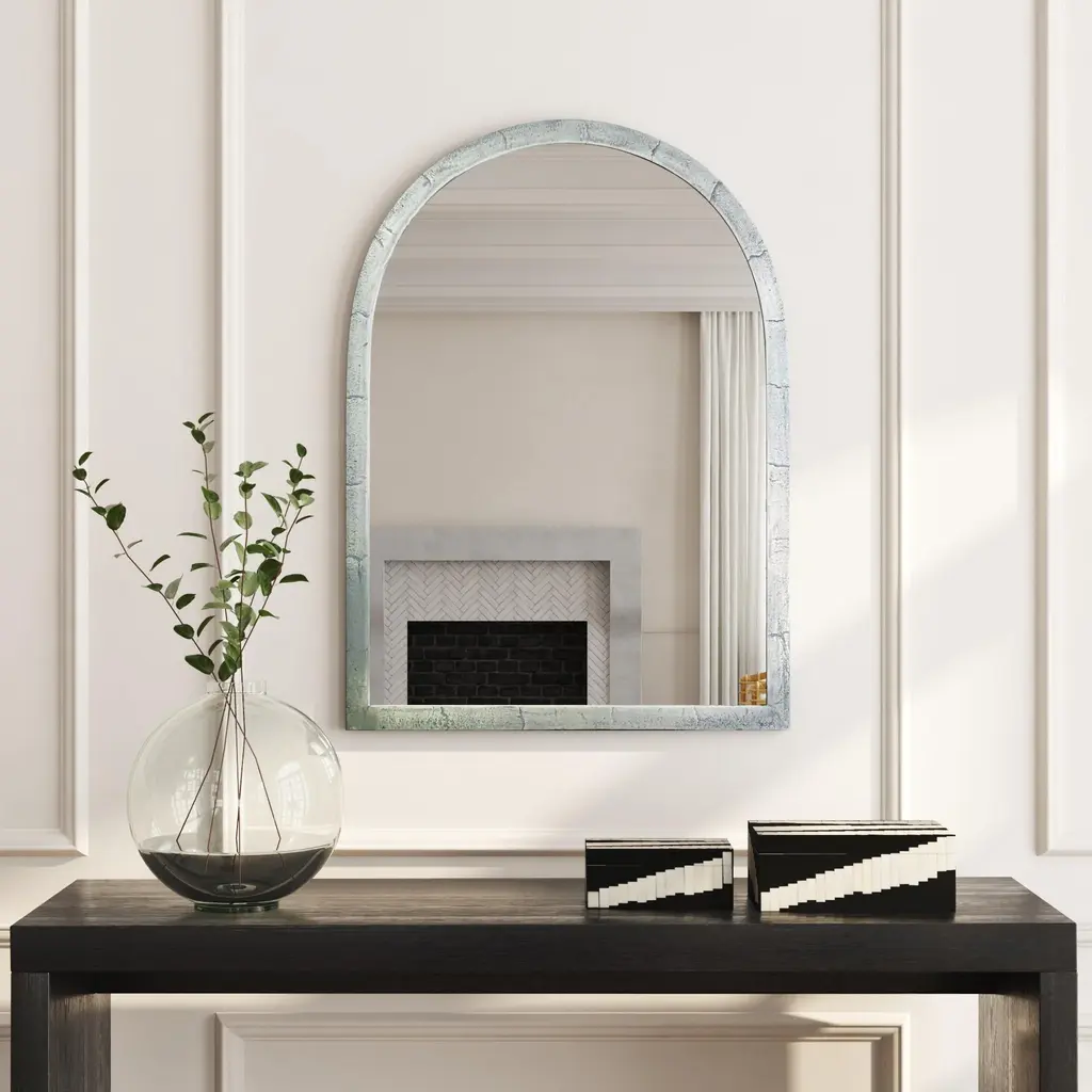 Combining modern curved lines with organic elements, this statement mirror has timeless elegance with artisan detailing. The metal frame, hand cast and plated with an antiqued grey finish, features an arched top design that adds a touch of contemporary sophistication to any space. Its surface interest, curved silhouette and a tall 31" in height, make this mirror a unique decor statement to your entryway, vanity, bedroom, or as a striking piece of dimensional wall decor. Due to the nature of materials and handcrafted processes applied in each piece, some variation in texture and color is to be expected, adding to the one-of-a-kind beauty of each mirror.