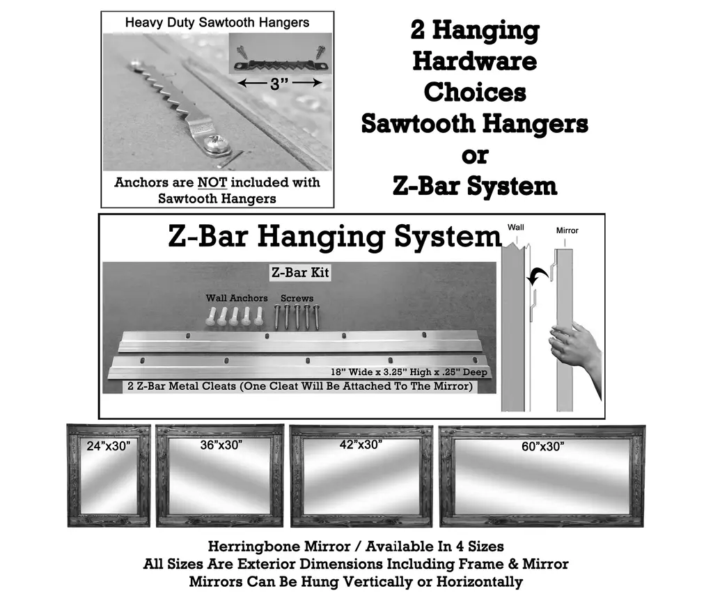 The Renewed Decor Herringbone Wood Framed Mirror was inspired from the old wooden window sashes from my childhood home. The frame is constructed from solid wood parts that are hand stained, distressed and carefully assembled to create a unique design. Our mirror has a reclaimed style that everybody loves and that will enrich your space.Our Herringbone Mirror is custom made to order, Handmade in Warrington, PA USA. This is NOT a mass-produced product. Made from USA sourced rustic reclaimed styled eastern white pine and premium quality 1/4 inch glass mirror.Available in 20 Paint Colors & 4 Paint Distress Levels. Not sure on color we do samples, message us for details.Available in 4 sizes 24” x 30”, 30" x 36”, 42" x 30" or 30” x 60”, frame width is 4 inches. Mirror sizes are listed according to exterior dimensions. Mirrors can be mounted in a horizontal or vertical hanging orientation. LOOKING FOR A DIFFERENT SIZE? We are always open to custom projects, please contact us for a quote.Choose either heavy duty saw tooth hangers or Z-bar Hanging System, Z-Bar hanging system is highly recommended for the 60" x 30" sizeOver the years we have developed specialized package material including custom made corners, premium quality burst resistant bubble padding and customized boxes to help us ship all over the world. We are proud to have well less than .05% shipping damage. If that rare event does occur and your mirror is damaged, we will replace or fully refund your purchase.