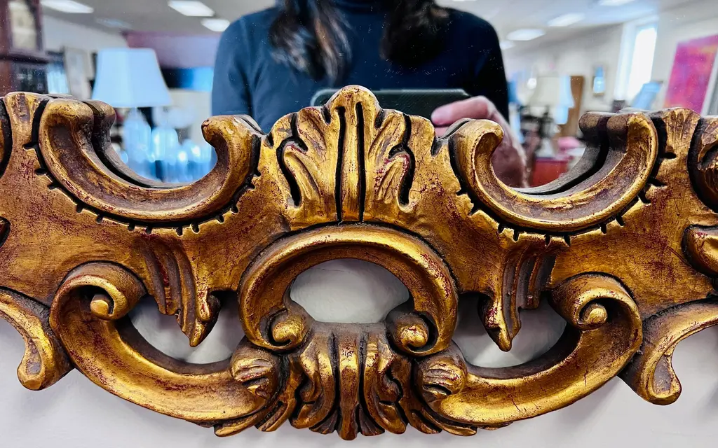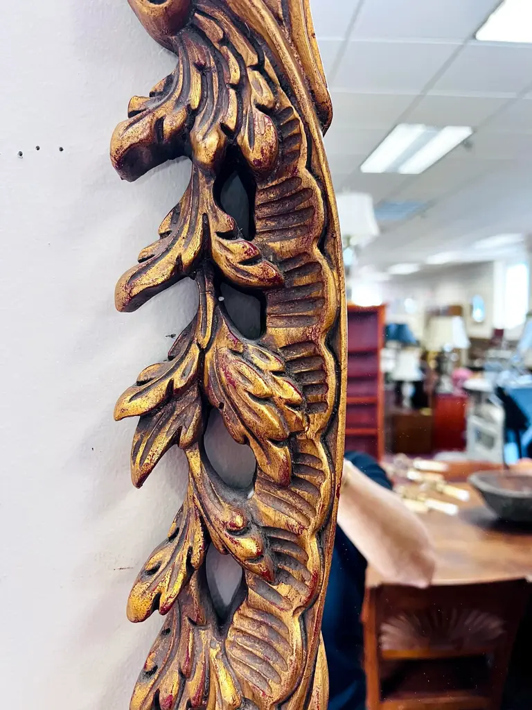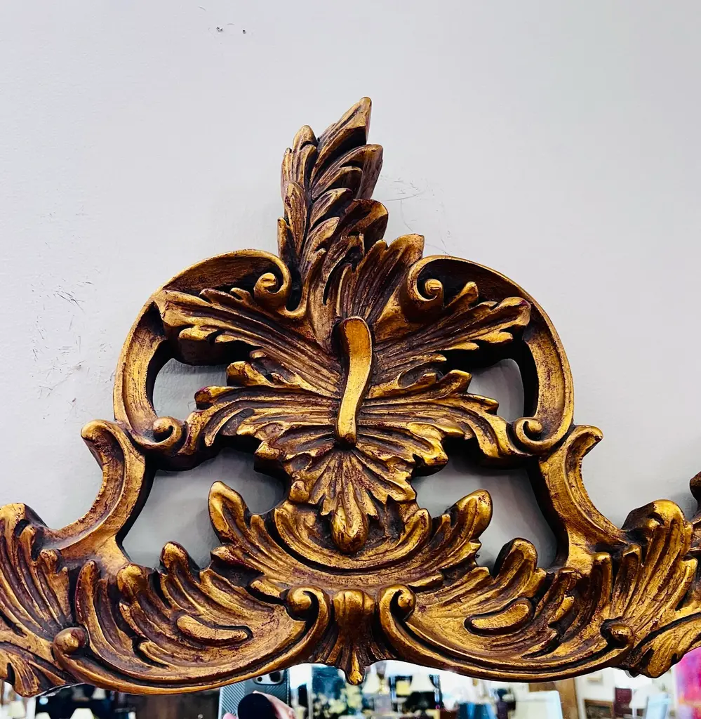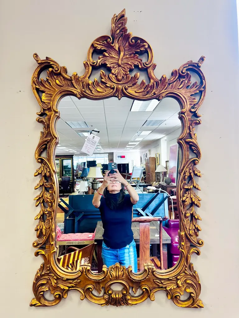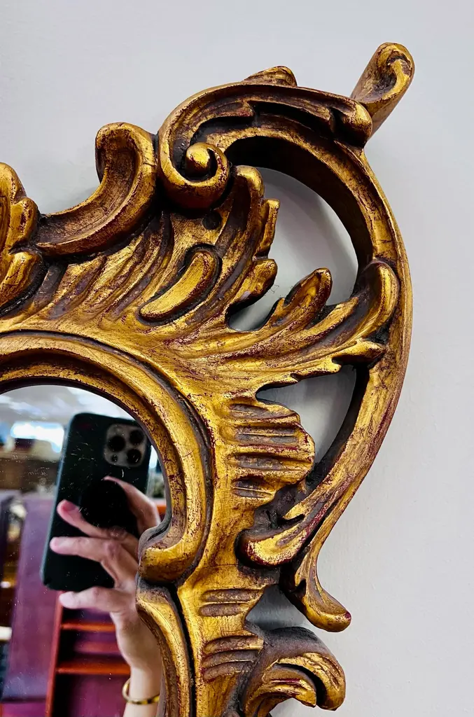This exquisite rococco style giltwood mirror with its intricate carvings and lavish gilt finish, reflecting a timeless elegance that enhances any room. We have two available.