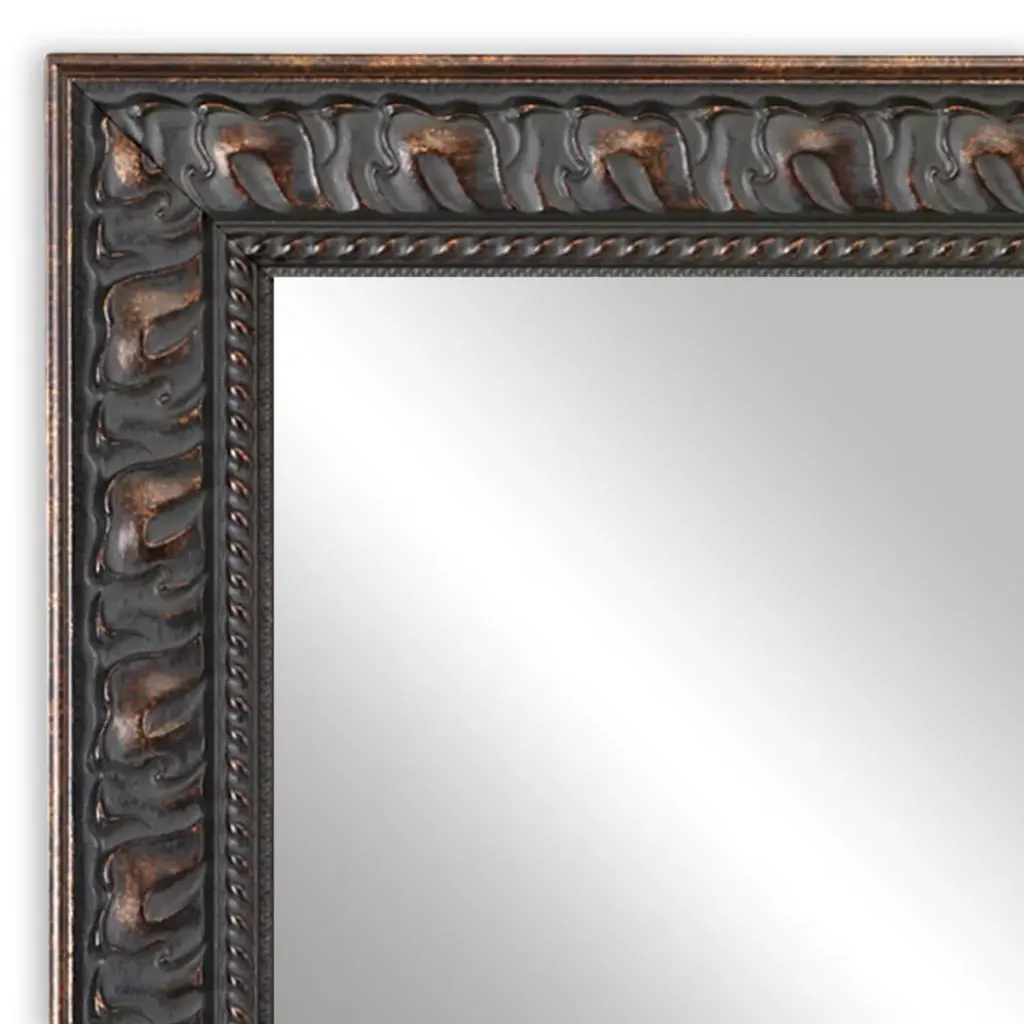 The Hillsborough frame adds an artistic touch to your mirror with an abstract design on the outer edge and scrollwork that rings the interior. The antiqued metallic finish highlights the beautiful details of this ornate framed mirror design.Hangrail for installation will be applied on the width of the frame. All assembly hardware and instructions will be included. Additional hangrails are included if the opposite orientation is desired for installation. The dimensions displayed are the final outside dimensions of the frame, including the mirror. CATII safety backing applied on all mirrors. Approved for high-moisture areas such as bathrooms.