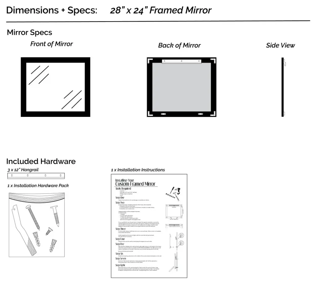 The Hillsborough frame adds an artistic touch to your mirror with an abstract design on the outer edge and scrollwork that rings the interior. The antiqued metallic finish highlights the beautiful details of this ornate framed mirror design.Hangrail for installation will be applied on the width of the frame. All assembly hardware and instructions will be included. Additional hangrails are included if the opposite orientation is desired for installation. The dimensions displayed are the final outside dimensions of the frame, including the mirror. CATII safety backing applied on all mirrors. Approved for high-moisture areas such as bathrooms.