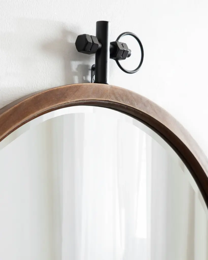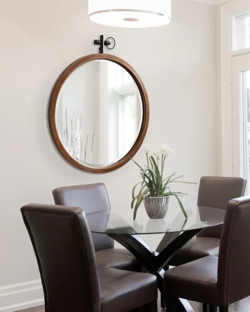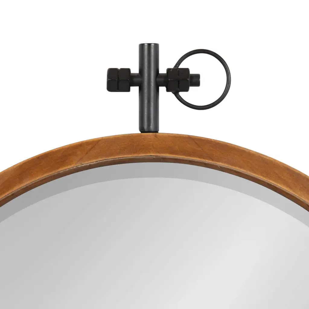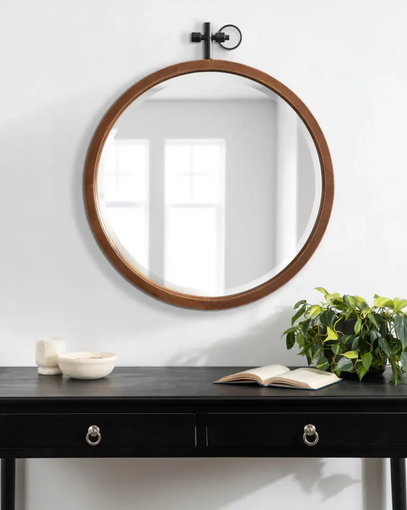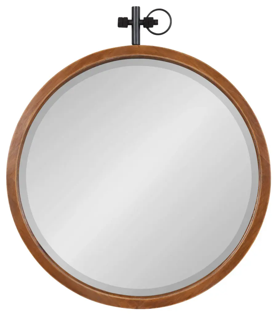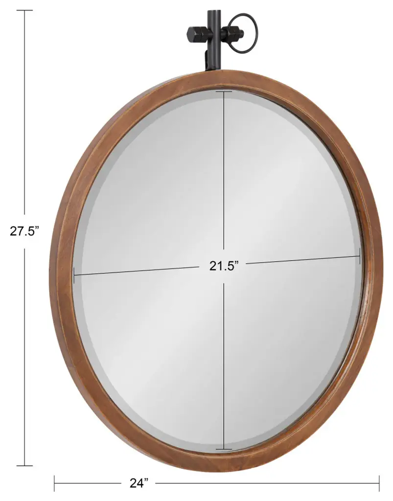 Your home deserves an accent piece that echoes the craftsmanship and charm of decades of design. Choose the Hogan mirror to allow your home a rustic, decorative piece that makes a bold statement. Inspired by modern farmhouse style, the Hogan features a wooden frame finished in a sophisticated walnut brown stain. This mirror also features an ornamental clasp at its crown, giving it that ultimate vintage industrial look. The Hogan mirror''s round shape allows you to utilize it in various decor spaces: use it as a decorative feature in your living room, bedroom, entryway, or dining room. Adding a mirror to your home decor allows for more light in your space, making it feel more open, inviting, and spacious. With a 24-inch diameter, the Hogan mirror also makes a charming bathroom mirror above your vanity. Hang this rustic mirror in only a matter of seconds with the installed hanger that is welded onto the back of the frame.• Modern Farmhouse Design: The Hogan wall mirror features a vintage farmhouse-inspired design, with a round wooden frame and an ornamental clasp at its crown• Quality Material: This sophisticated mirror features a resilient wooden frame for a sophisticated and lasting farmhouse accent• Impressive Size: The overall dimensions of the sophisticated Hogan mirror are a 24 inch diameter, making an eye-catching and dimensional statement piece for any room• Versatile: This large round mirror functions fantastically as a striking bathroom vanity mirror or as a decorative accent in your living room, bedroom, entryway, or dining room• Easy to Hang: The Hogan mirror features a hanger welded to the top for easy hanging in a matter of seconds