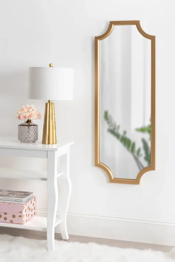 Using a mirror to dress up a part of your home is a simple choice with the Hogan Scallop Full-Length Wall Mirror by Kate and Laurel. It is a stunning addition to large wall spaces and a truly useful piece in your home decor. An easy way to revamp a space, this 18 x 48-inch head-to-toe mirror is the perfect size to add a stylish statement to a bedroom or hallway. The large frame makes it a natural choice for your bathroom too. The elegant scalloped shape frame creates a stylish alternative to traditional corners and blends with other styles well, so it is sure to fit anywhere in your home.• Framed dimensions of the Kate and Laurel Hogan Scallop Mirror are a full-length wall display at 18 x 48 inches, the mirror surface measures 15 inches by 45 inches• Built of a durable wood material with gracefully scalloped corners. Perfect for any bedroom or bathroom, that needs a full length mirror with the right look to match your style• Hang it anyway that works for your space. The attached D-hangers allow for horizontal or vertical installation• The lovely curves and cutouts of its design give this mirror a modern romantic look• The wooden frame''s profile is 1.25 inches wide with a beveled design going in towards the mirror giving it one more detail that adds to its charm