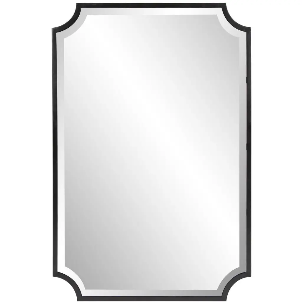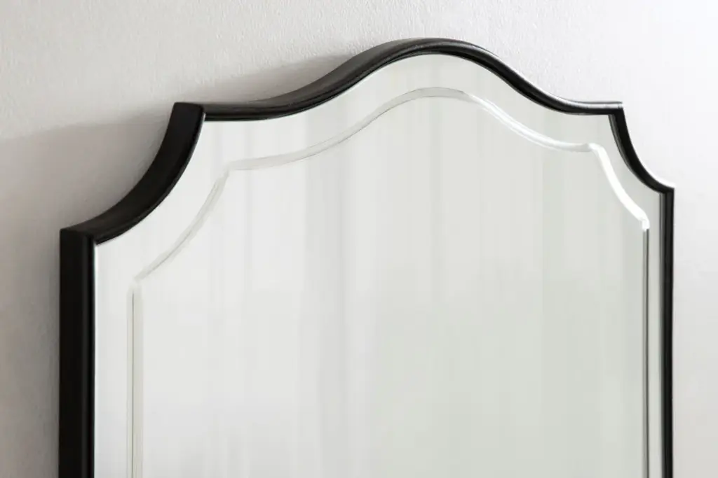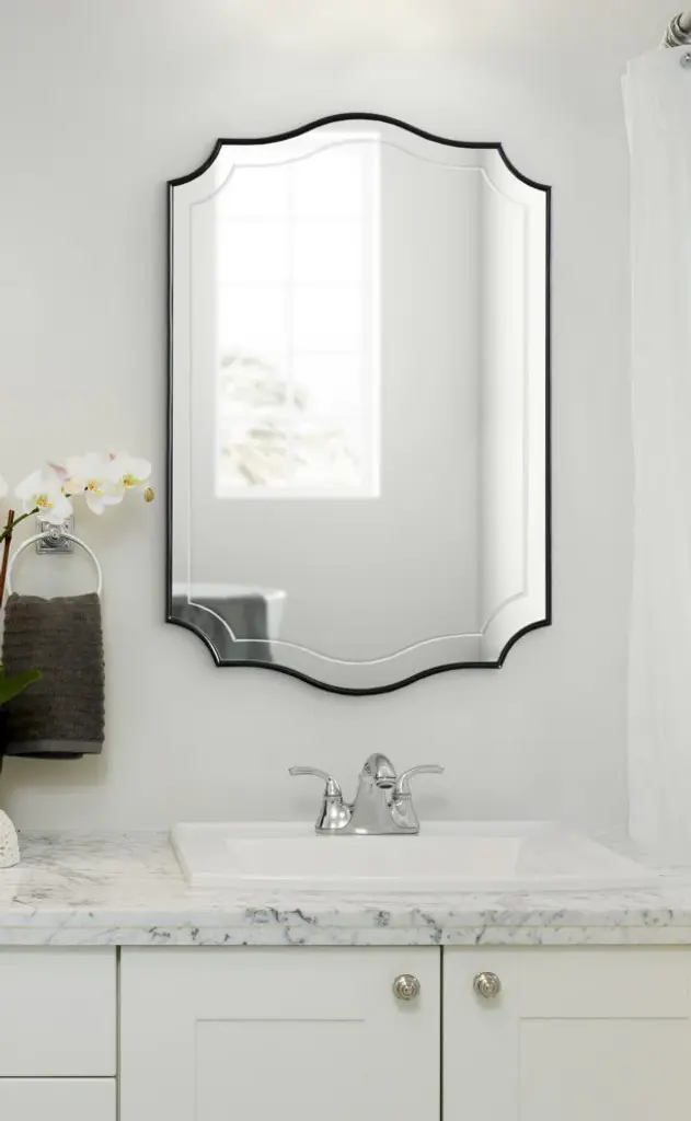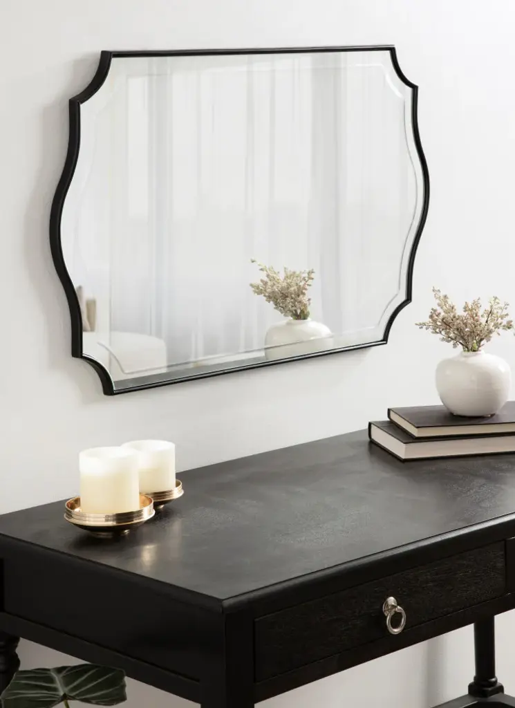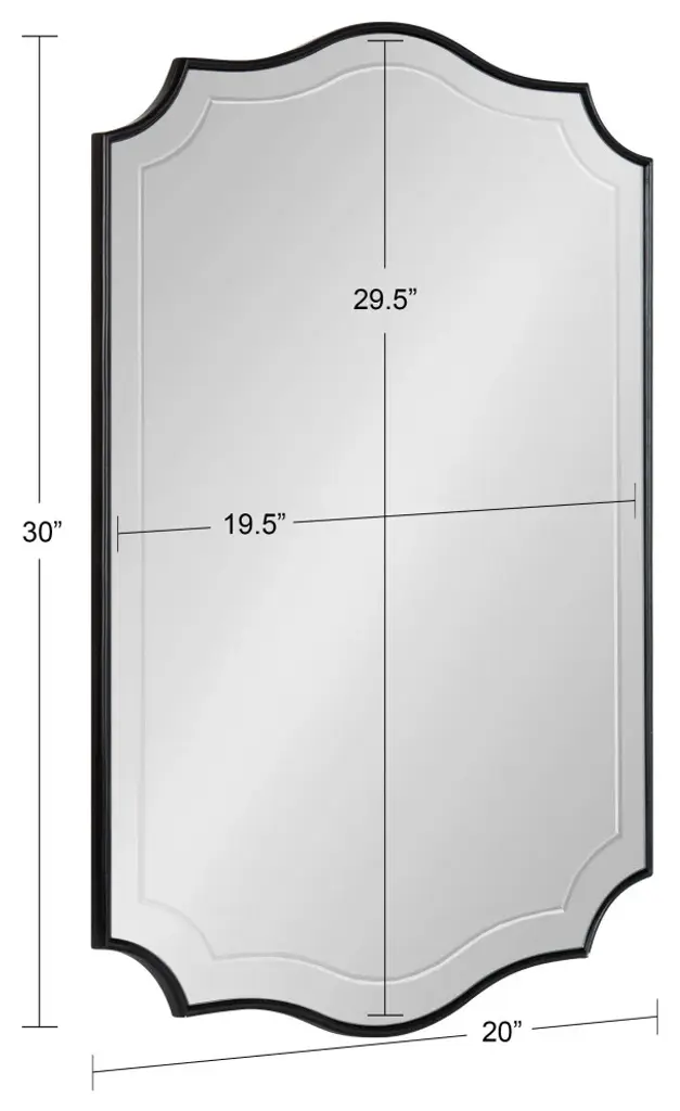 Showcase an effortlessly glamorous style in your home by hanging the Hollyn wall mirror. Inspired by traditional glamour, the Hollyn mirror features a chic, scalloped edge on its frame in addition to a v-shaped groove within to enhance its dimensional look. The elegance of this mirror is emphasized by its bold and sophisticated black finish, projecting a refined aesthetic from your wall. The overall dimensions of the beautiful Hollyn mirror are 20 inches wide by 30 inches tall, creating a ravishing focal point to draw the eye and illuminate your space. This mirror hangs vertically and horizontally to blend into various wall displays and galleries throughout your home, creating a truly versatile statement piece. The large size is perfect for use as a bathroom vanity mirror or a decorative accent piece for your bedroom, entryway console, or living room mantle. If you want to make a captivating visual statement in your dining room, you can purchase two and hang them side by side. Use the metal D-ring hangers attached to the back of the Hollyn to hang it in a matter of minutes. • ELEGANT DESIGN: The Hollyn features a beautiful and glamorous design with a scalloped, rectangular frame that brings a heightened sense of sophistication to your decor • SLEEK FINISH: Craft the elegant wall display of your dreams with the sleek and sophisticated black finish on the Hollyn''s scalloped frame • LARGE SIZE: The Hollyn''s overall dimensions are 20 inches wide by 30 inches tall, making it a commanding glamorous focal point to hang in any room of your home• VERSATILE: The Hollyn mirror hangs vertically and horizontally to cohesively blend into any decor theme or wall gallery• EASY TO HANG: Use the D-ring hangers attached to the back for quick and easy installation in a matter of minutes
