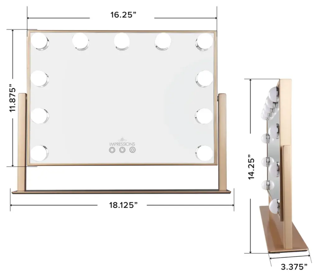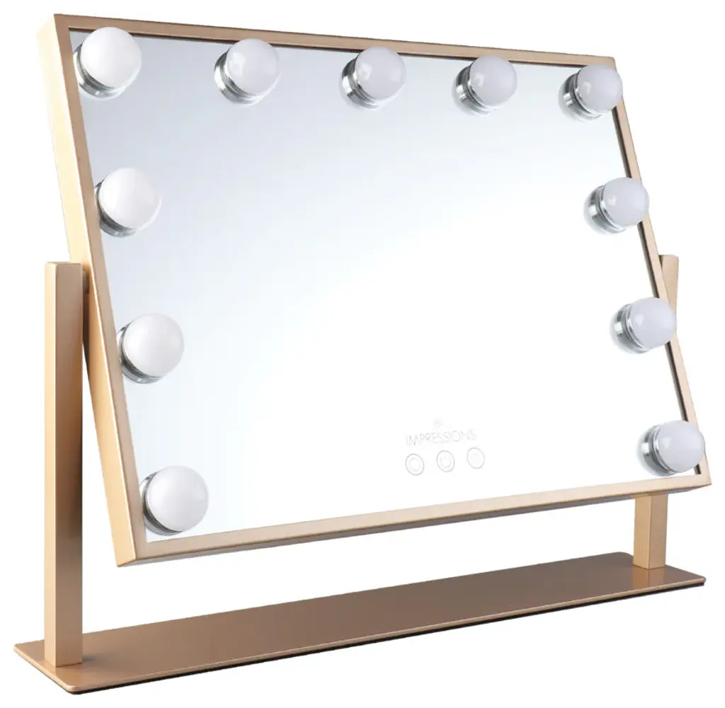 Impressions Vanity Bring your inner artist out with the Hollywood Tri Tone Artiste XL makeup mirror. Equipped with built in long lasting LED Lights around the mirror for even lighting. Tap the Power button to power it on or off. Tap the light color button to switch between cool white, natural, and warm light tones. Hold the light bulb button down to adjust brightness. Premium iron quality frame.DC plug in port.Features:MAKEUP MIRROR: Bring your inner artist with a beautiful dressing mirror. This Hollywood style mirror is perfect for you. It is surrounded by long lasting LED Lights for even lighting which creates a good lookTOUCH SENSOR SWITCH: This lighted mirror has a soft touch sensor switch to adjust the brightness to your desired level. Just tap the button to choose cool white, natural, and warm like 3 light color tonesTILT VANITY MIRROR: This vanity mirror base is made of premium quality iron. The mirror is full tilt, with this feature you can easily adjust to give your best look from any angle. So you can feel more comfortable during makeupPOWER OPTION: This smart mirror runs with a DC plug. Just tap the power button to power it up. Also, this button works mirror on or off. It''s a perfect gift for special occasions