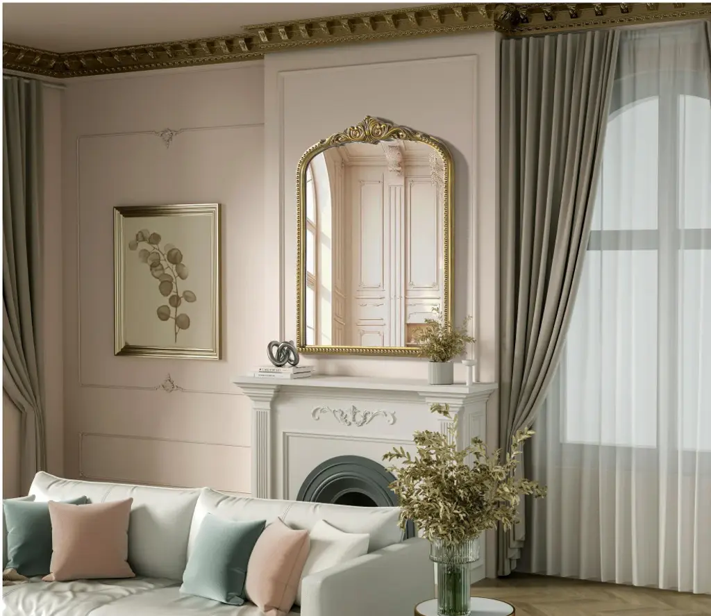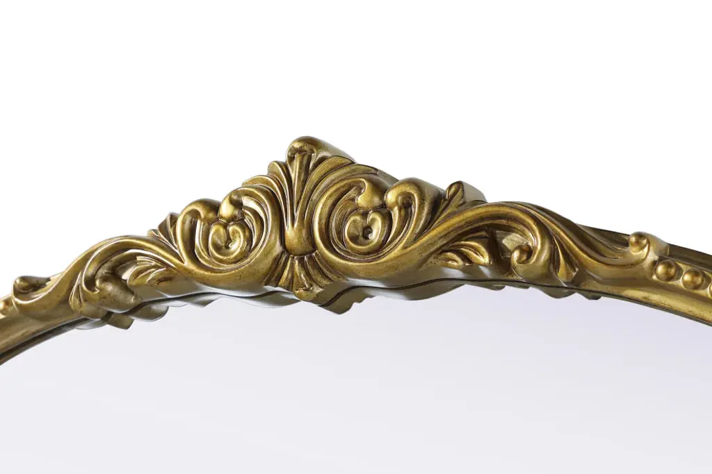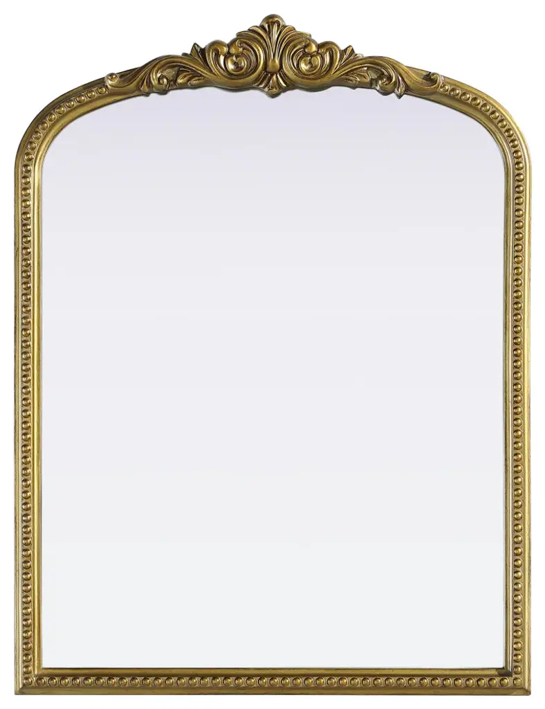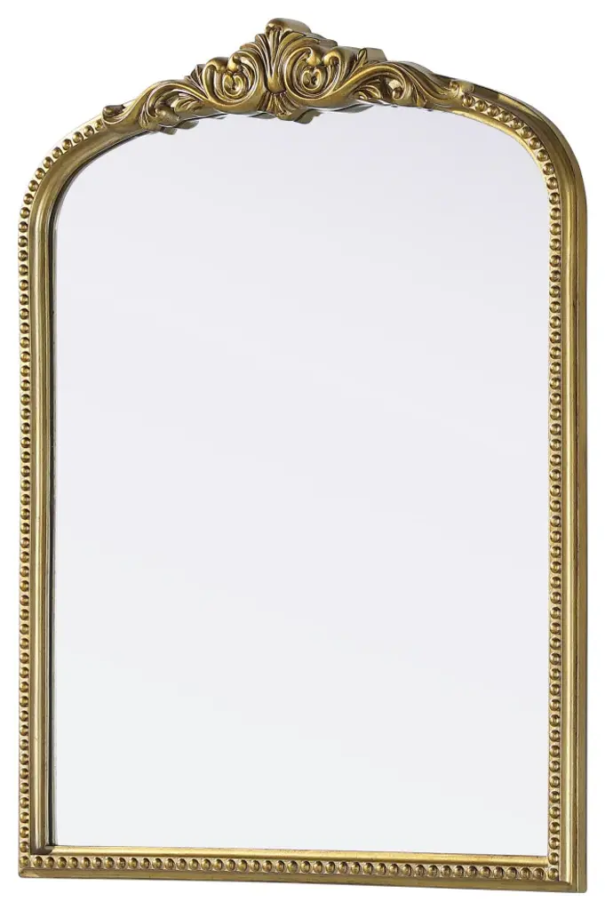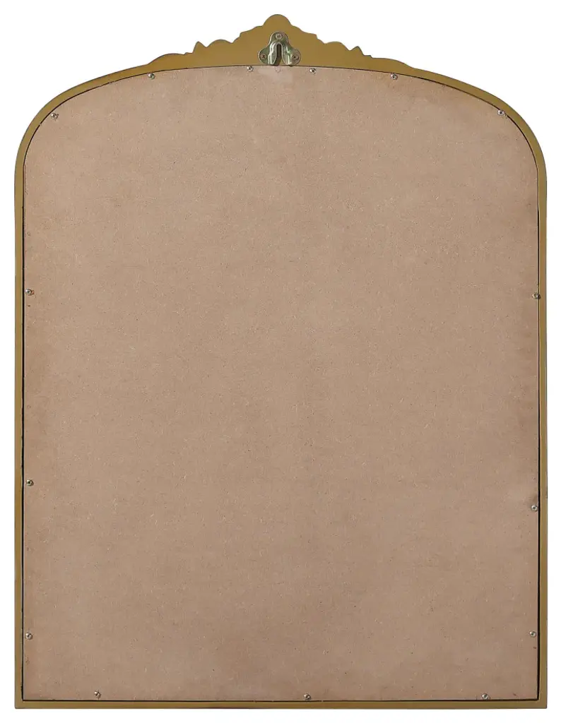Add a touch of old-world charm to your home with this antique brass arched wall mirror, designed to bring timeless elegance and vintage character to any space. The hand-painted distressed finish gives the frame an aged, classic appeal, while the ornate crest and intricate detailing add a traditional European touch. Crafted from resin with an MDF backing board, this mirror is both lightweight and durable. Designed for vertical hanging only, it features a single metal inset hanger for easy wall mounting (hardware not included). Whether placed above a fireplace mantel, in an entryway, or as an accent piece in a living room, this mirror creates a refined focal point. Available in multiple sizes and an alternative vintage bronze finish, it complements a variety of interiors, from classic and French country to vintage-inspired spaces.The mirror features a softly curved arch at the top, adding a refined and timeless touch to any space.The distressed antique brass finish is meticulously hand-painted, giving it a weathered, vintage-inspired appeal.The sculpted crest with scrolling accents at the top enhances its traditional and French-inspired design.Crafted from sturdy resin, providing moderate weight durability while maintaining a sophisticated aesthetic.Designed to be hung vertically, making it an ideal statement piece for walls.Equipped with one metal inset hanger for easy mounting (hardware not included).Comes with an MDF backing board, reinforcing the structure for long-term stability.Ideal for placement above fireplace mantels, entryways, or accent walls, bringing a touch of old-world charm to interiors.