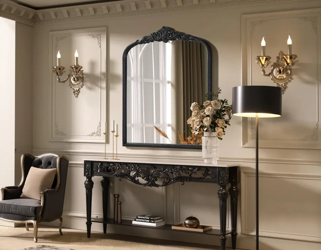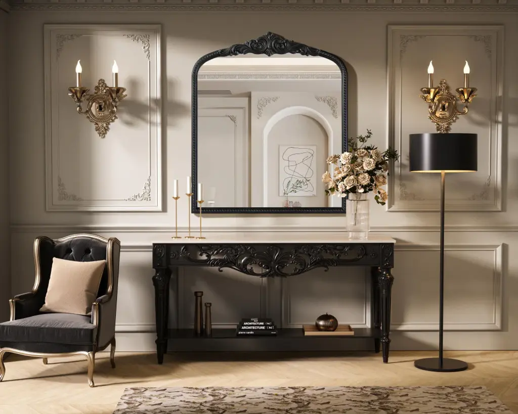 Bring classic charm and vintage character to your home with this arched wall mirror in a distressed vintage bronze finish. The hand-painted frame showcases ornate scroll and floral detailing, creating a refined, old-world aesthetic. Crafted from resin with an MDF backing board, this mirror is lightweight yet durable. Designed for vertical hanging only, it includes two metal inset hangers for easy installation (hardware not included). Whether placed above a fireplace mantel, in an entryway, or as an accent piece in a living room, this mirror enhances the space with its architectural beauty. Available in multiple sizes and an alternative antique brass finish, it is a versatile addition to classic, vintage, or French-inspired interiors.The mirror features a softly curved arch at the top, adding a refined and timeless touch to any space.The distressed vintage bronze finish is meticulously applied by hand, creating an aged, antique look with rich depth.The sculpted crest with scrolling accents at the top enhances its traditional and French-inspired design.Crafted from sturdy resin, providing moderate weight durability while maintaining a sophisticated aesthetic.Designed to be hung vertically, making it an ideal statement piece for walls.Equipped with two metal inset hanger for easy mounting (hardware not included).Comes with an MDF backing board, reinforcing the structure for long-term stability.Ideal for placement above fireplace mantels, entryways, or accent walls, bringing a touch of old-world charm to interiors.