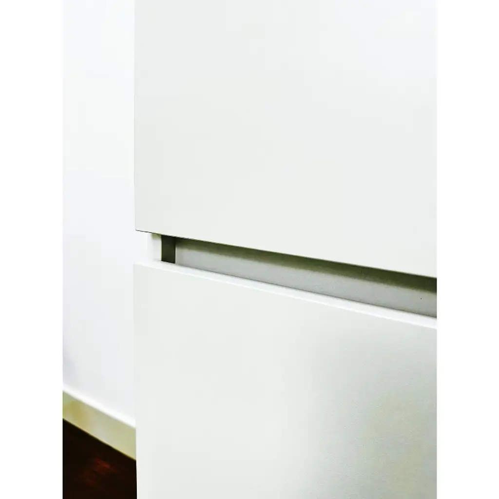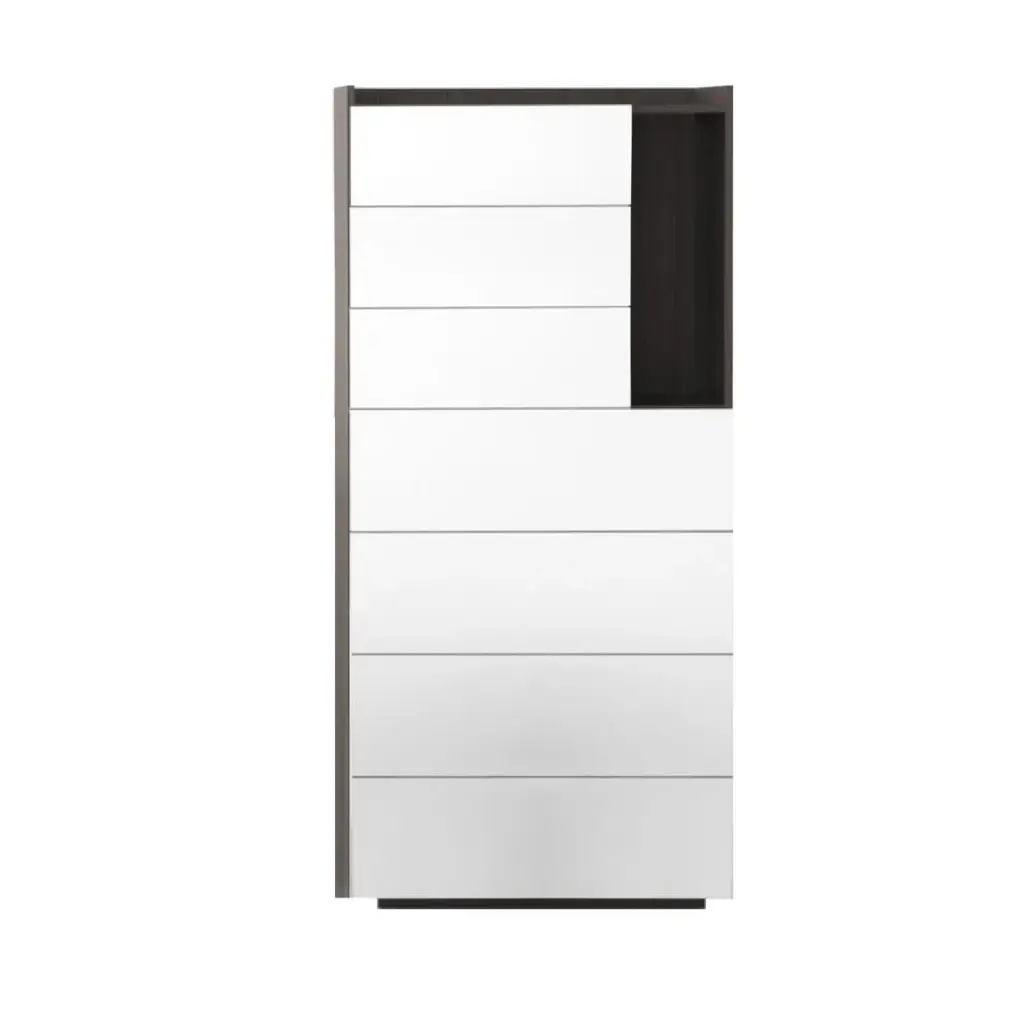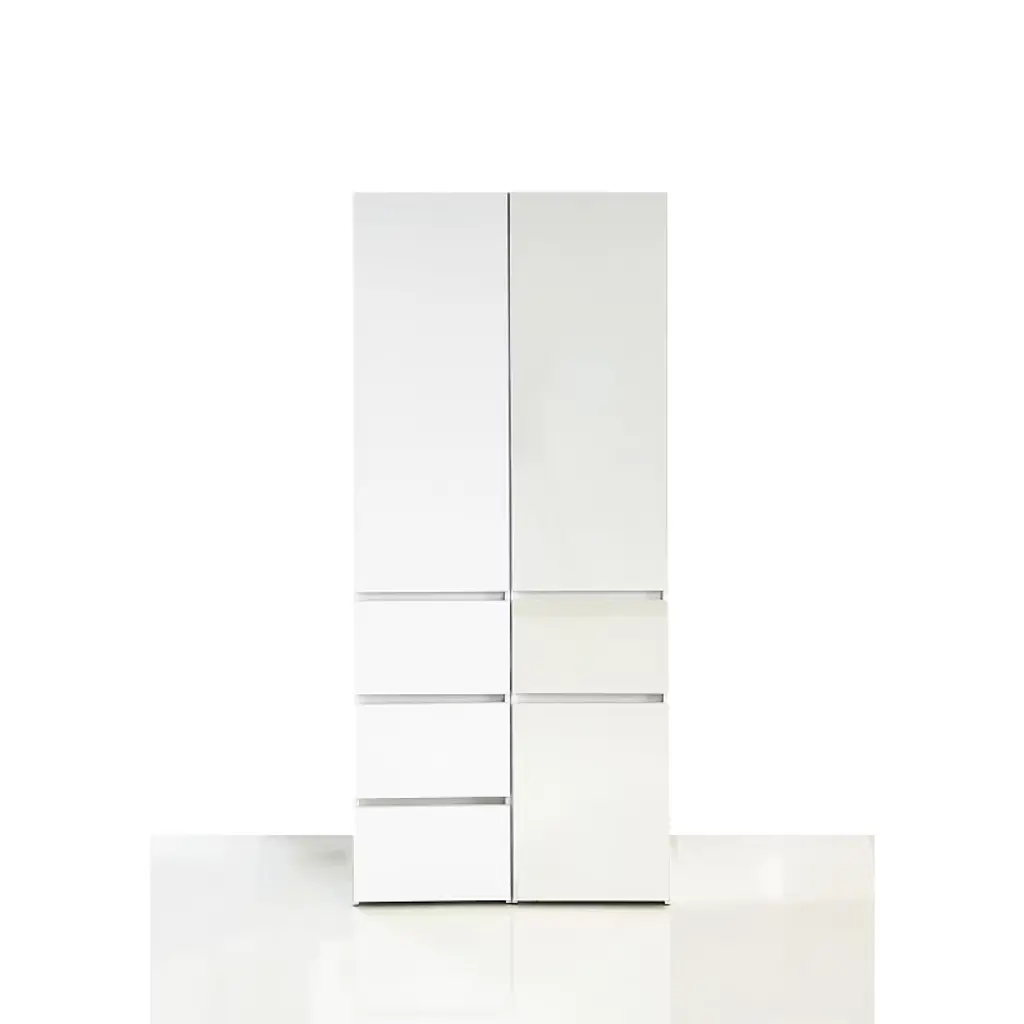 The Elise Slim Modular Closet Tower offers a sleek and functional storage solution ideal for any space. Its compact 15.7-inch width makes it perfect for utilizing leftover areas in a closet or even as a kitchen pantry. This versatile unit can be used individually or connected with others to create a customized storage system. Designed for maximum flexibility, the Elise Tower can be configured with adjustable shelves or a hanging rod. It seamlessly integrates into various rooms, from closets and bedrooms to kitchens and laundry rooms. The inclusion of mirrors and drawers provides additional customization, all achieved with just two simple SKUs. Built for durability, Elise features a water, heat, and scratch-resistant surface, ensuring long-lasting quality. Ball-bearing glides enhance sturdiness and ease of use, while fully finished edgebanding on all sides delivers a polished appearance.