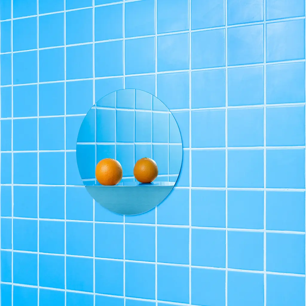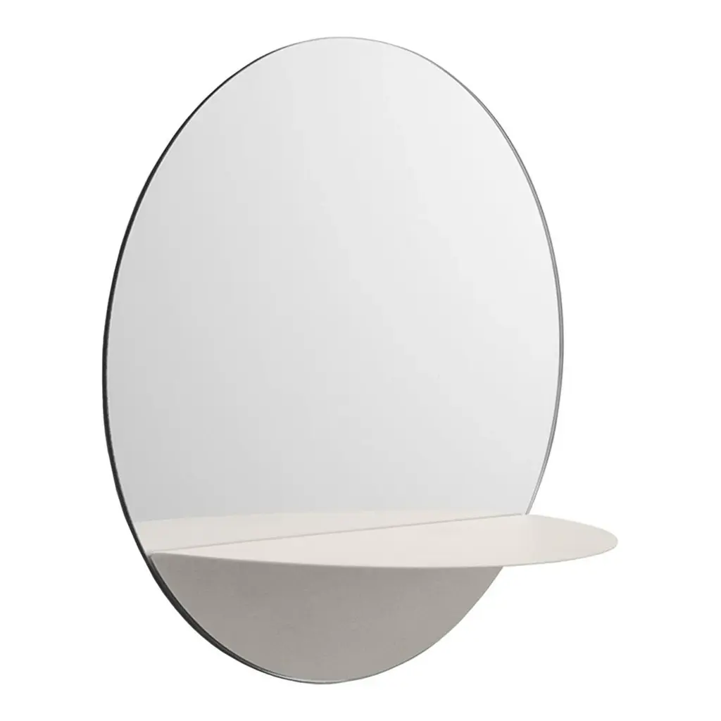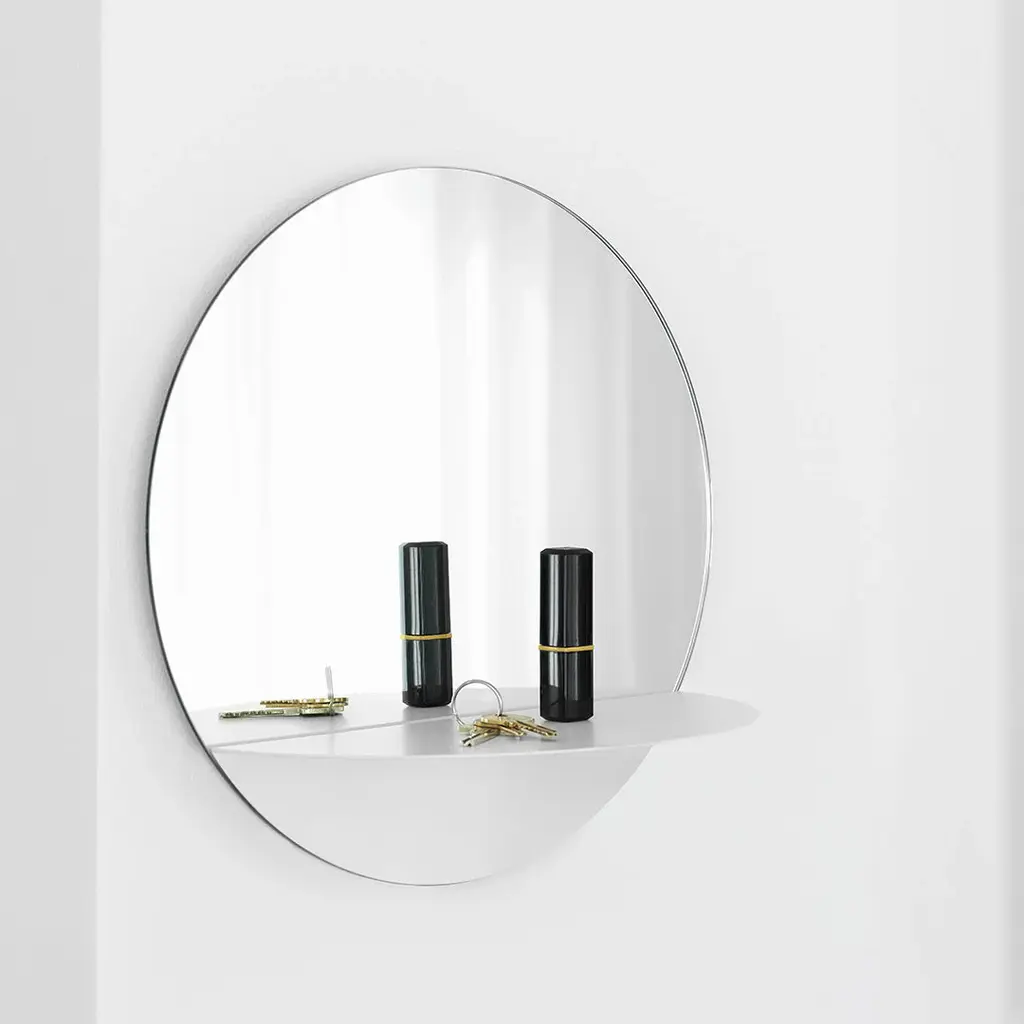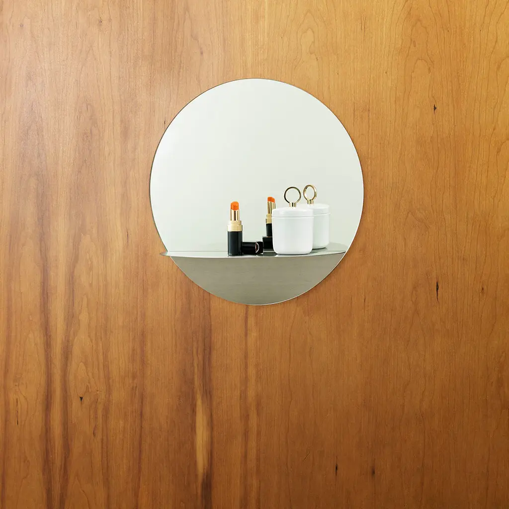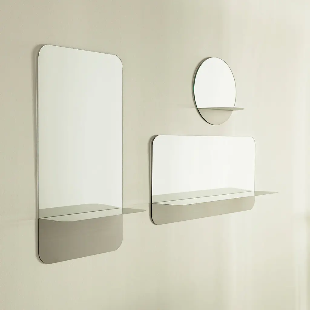 Horizon is a collection of wall mirrors in varying geometric shapes that all have a steel shelf integrated into the design. The shelf serves as a practical place to put things on, at the same time creating a beautiful visual effect. The Horizon wall mirrors are the perfect hybrid between functionality and aesthetics. Horizon comes in three versions: a horizontal and a vertical mirror in the shape of rounded rectangles, plus a smaller circular one. With a simple geometric design, the mirror variations create a poetic play on reflections. The steel shelf has a powder coated surface. The glass mirror is glued to the surface.