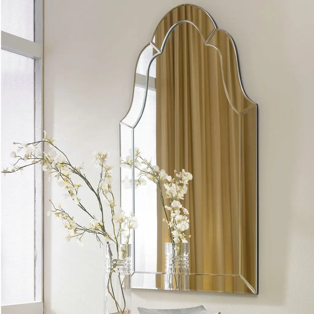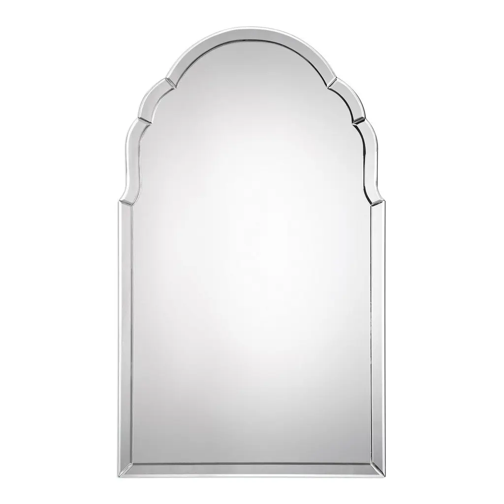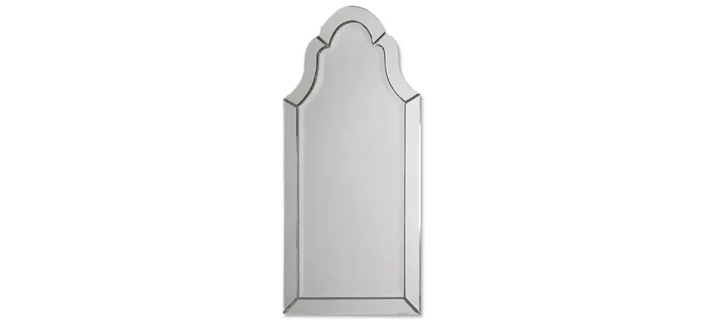 This frameless, arched mirror has polished edges for a smooth, clean finish. The etching and v-grooves give wonderful character to this beveled mirror.