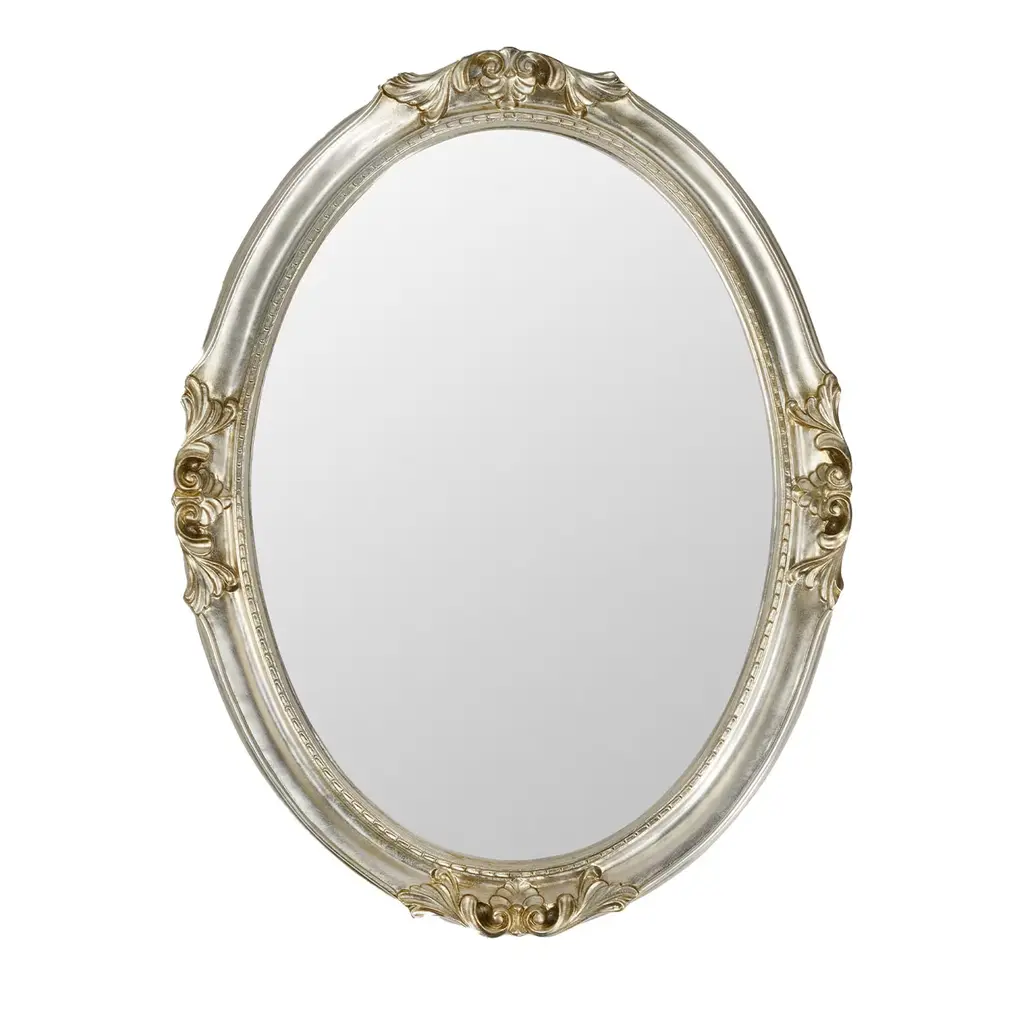 The Queen Ann Mirror features an antique silver finish. The rectangular frame is made from wood and is accented with a beaded textured inset and decorative adornments on each side of the frame. For more added detail the mirror features a one inch bevel. Its Traditional style makes this mirror a favorite for bringing some flair to your decor. This simple yet stunning piece would be a great addition to any room. It is a perfect focal point for an entryway, bathroom, bedroom or any room in your home. D-rings are affixed to the back of the mirror so it is ready to hang right out of the box in either a horizontal or vertical orientation! Also available in an oval shape.