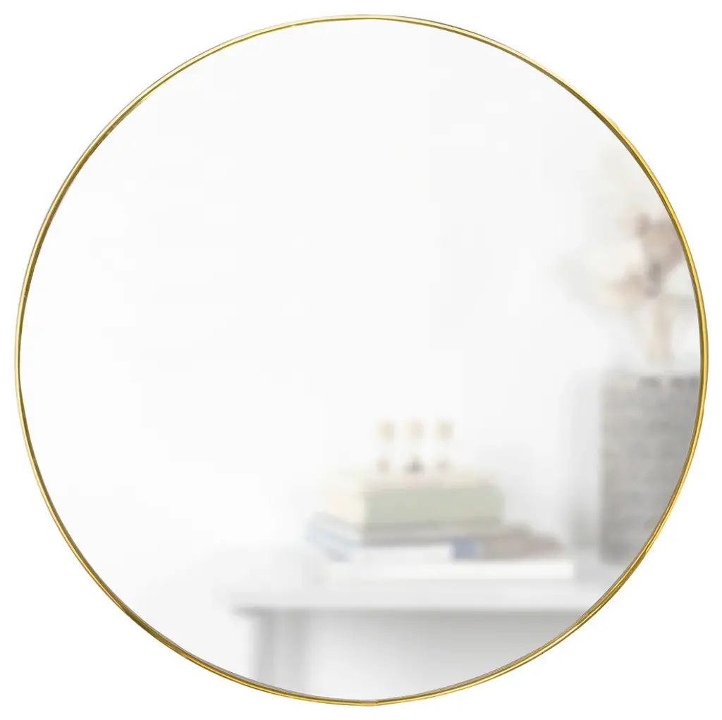 Introducing the Hubba Mirror by Umbra. Hubba is a large wall mirror that is ideal for heavy traffic areas in your home, such as entryways, washrooms, living rooms, and hallways. Its decorative gold frame has a look that is sure to complement any Decor. Because Hubba is large and reflective, it bounces natural and artificial light around the room, helping to brighten even the darkest of space. It also adds visual depth, which instantly makes smaller rooms appear bigger.