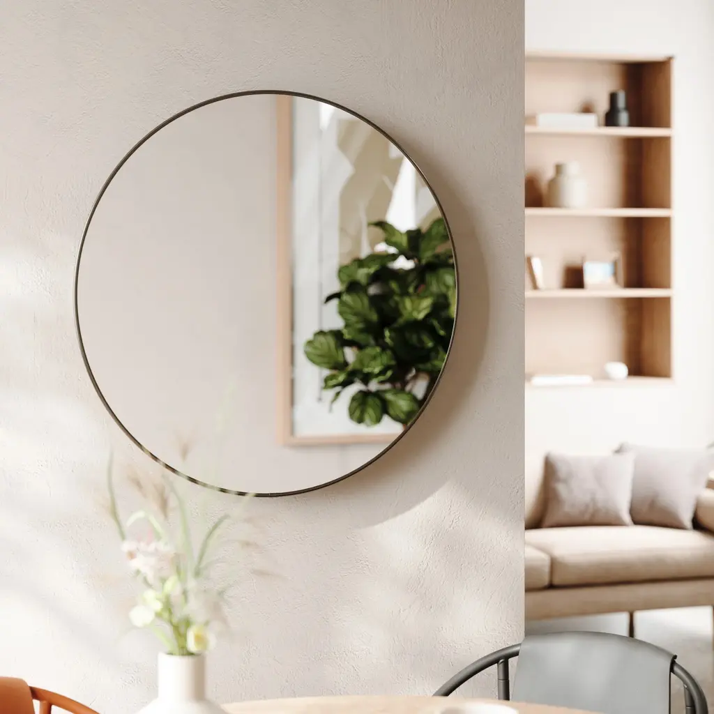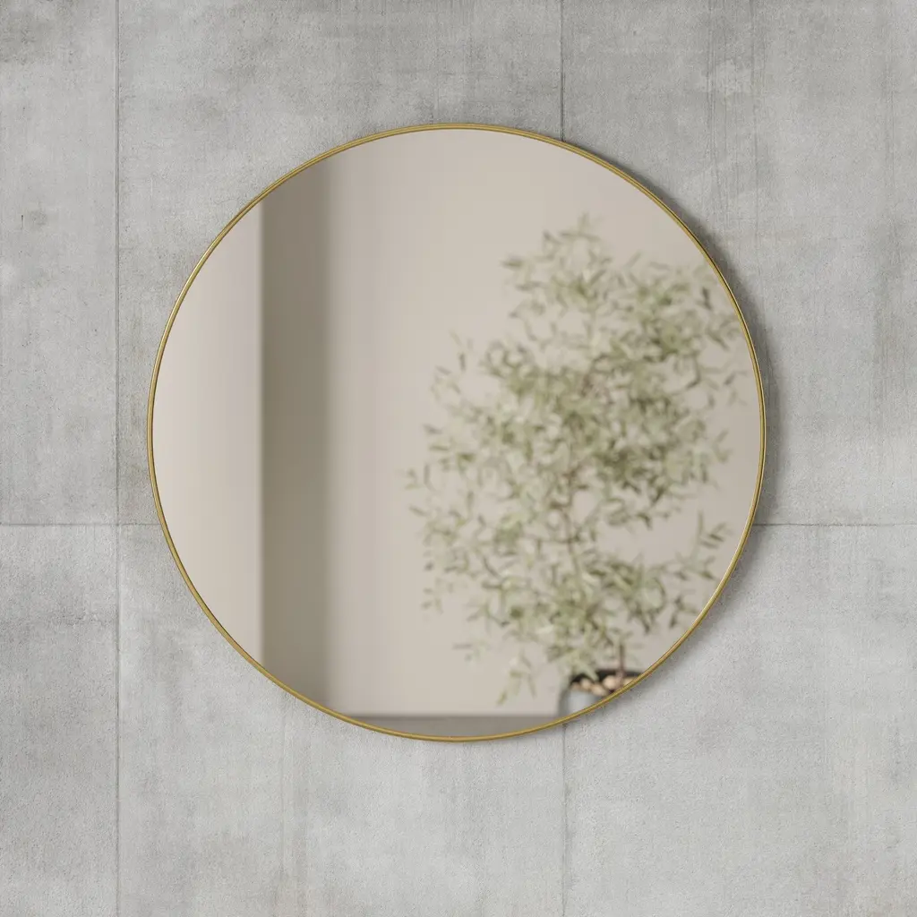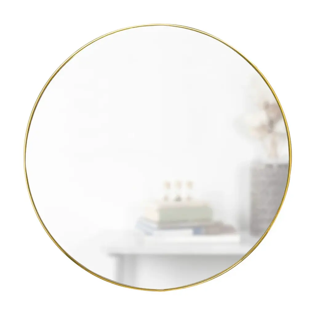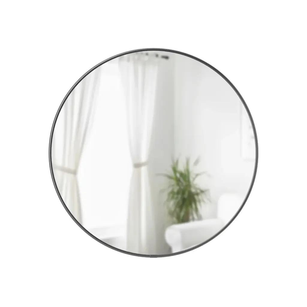 Metallic, simple and elegant, the Hubba Mirror from Umbra fits in and complements any space with sophisticated style. With an ample size and decorative metal frame, this mirror attracts more light, thus making your space appear larger and brighter. The perfect size for an entryway vignette, hallway, or as part of a vanity set-up in the master bedroom, this round mirror is easy to install with all hanging hardware included. Hang in any space in need of opening up and position to face a source of natural light for a bright and reflective room that is both welcoming and stylish. Highlights