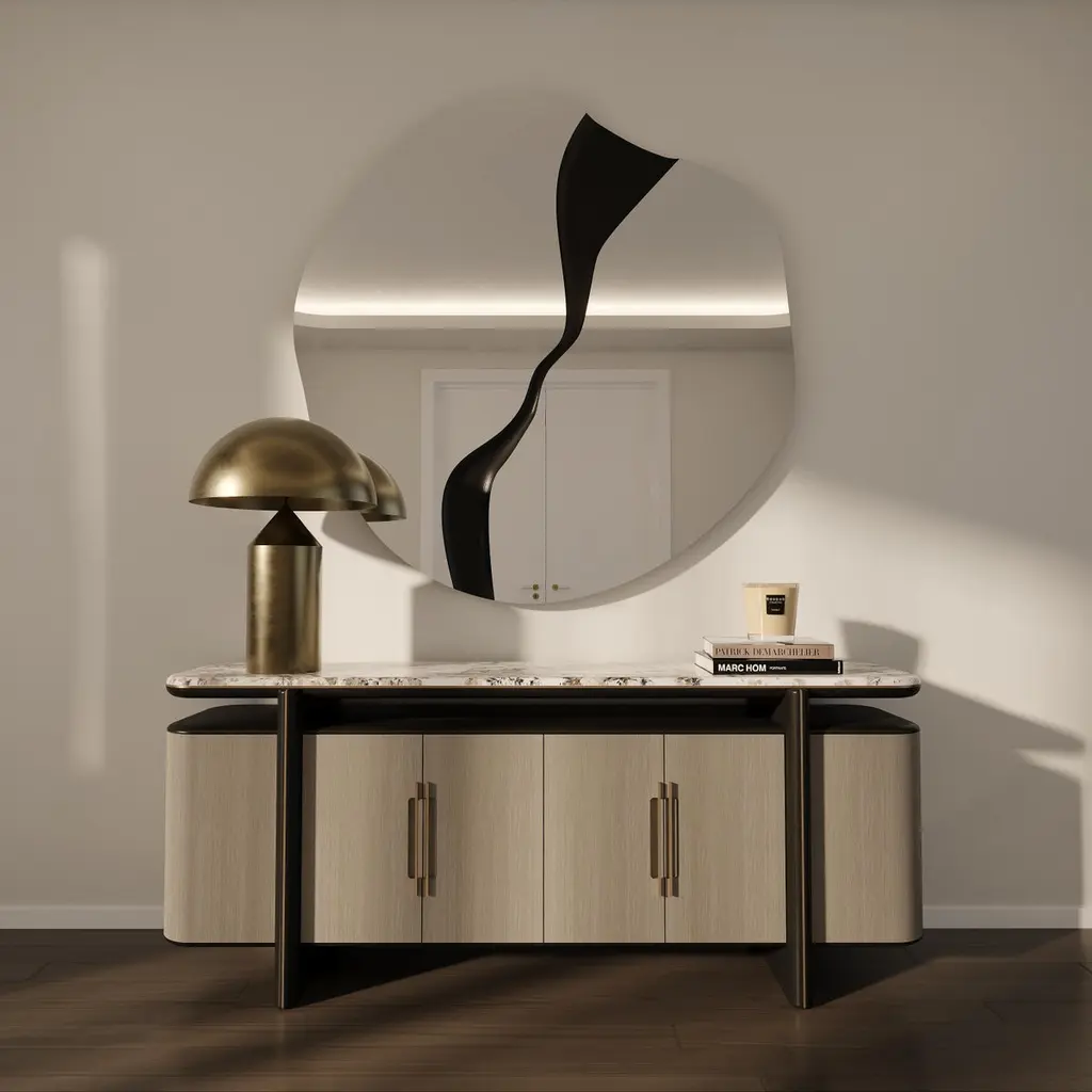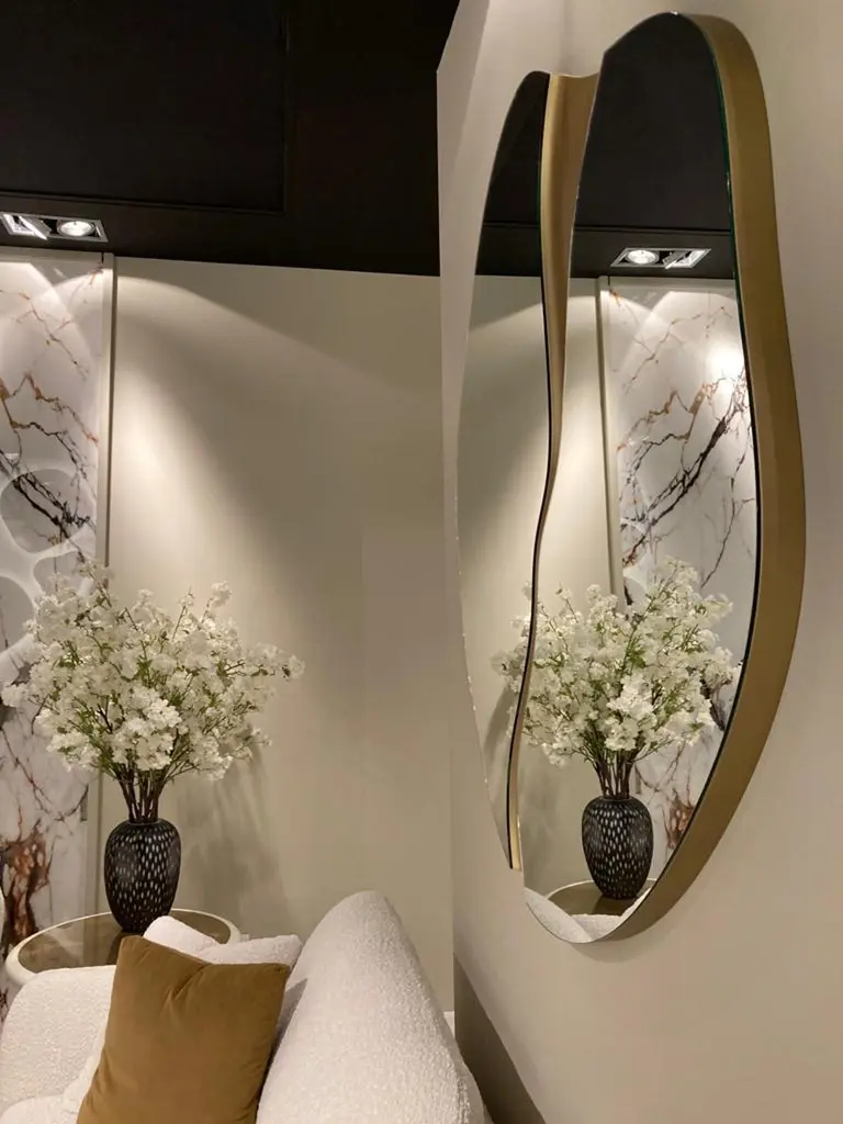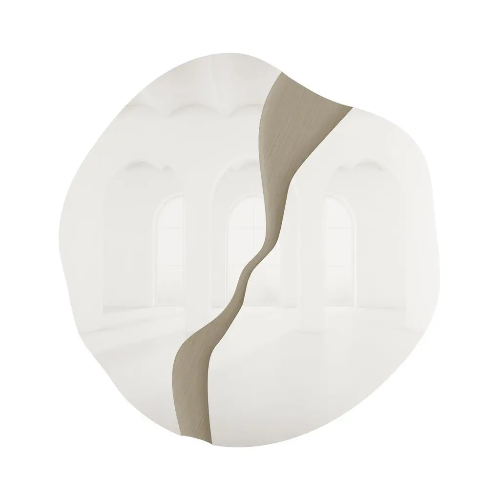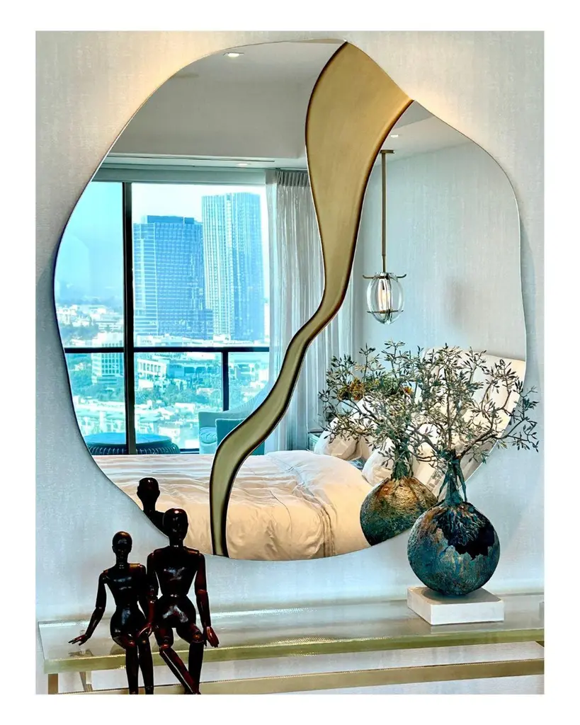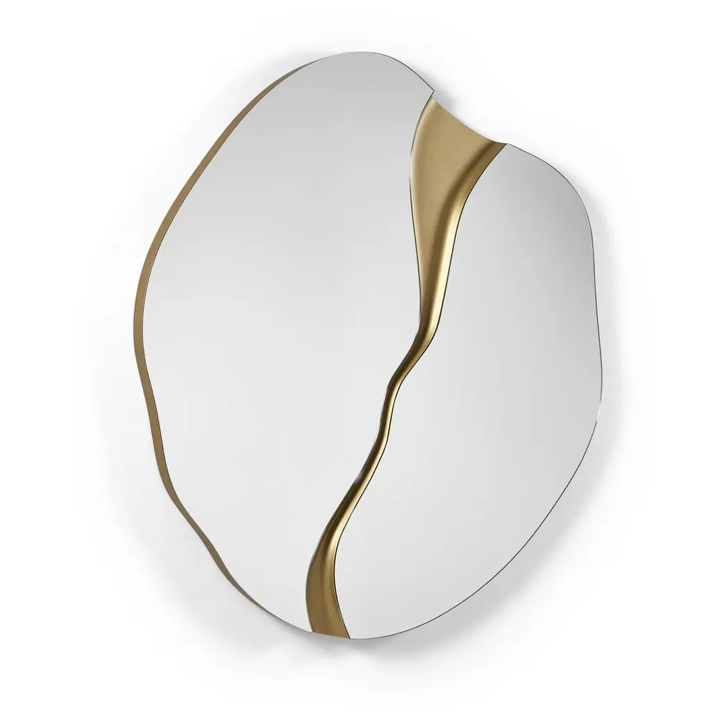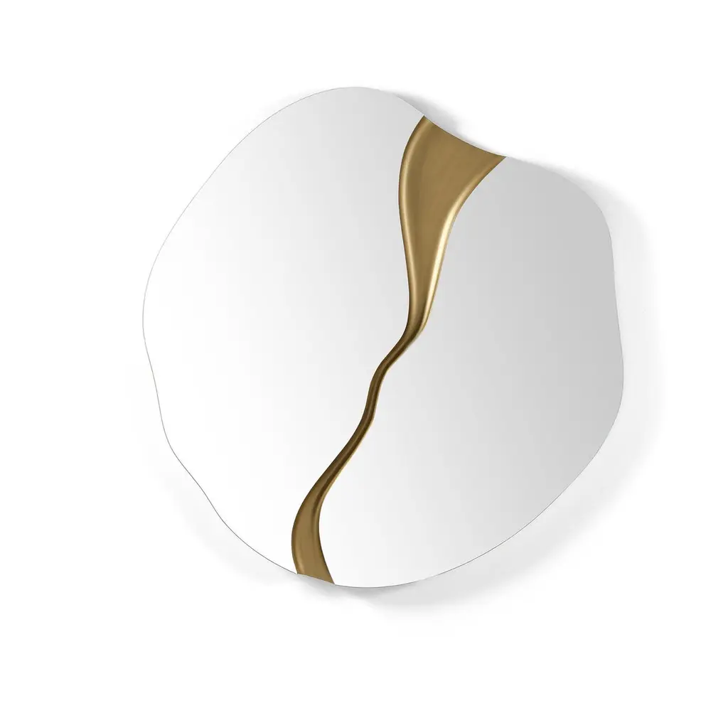 The organic-shaped HUDSON is a mirror of modern design, whose mirrored glass is crossed by the structure in brass color, in sinuous lines, making its design even more daring.Shown in natural mirror with antique brass lacquer structure.