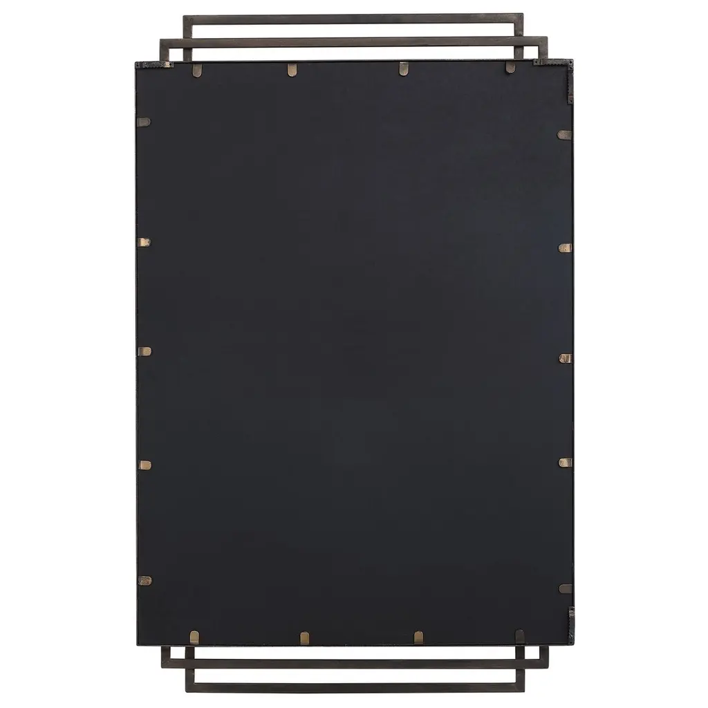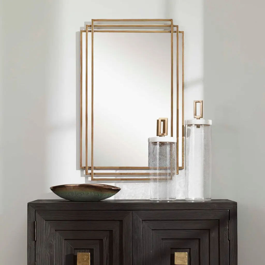 Showcasing elegant lines and a timeless style, this mirror features an overlapping solid iron frame finished in a sophisticated distressed brushed gold with silver highlights. May be hung horizontal or vertical.