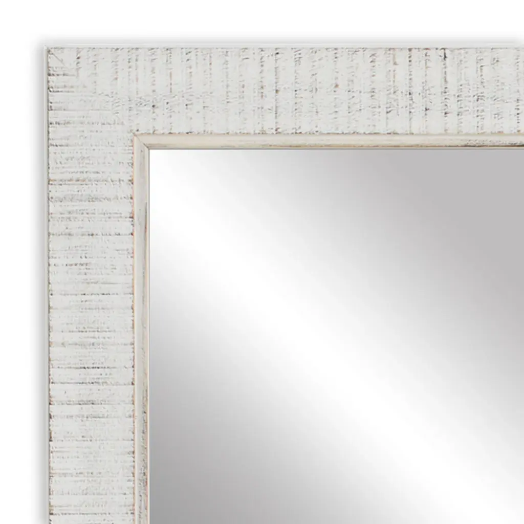 The Huntington framed mirror would look right at home in a beach house or a farmhouse. The rustic finish features scored lines that run perpendicular to the frame edge to take this custom design from simple to spectacular.Hangrail for installation will be applied on the width of the frame. All assembly hardware and instructions will be included. Additional hangrails are included if the opposite orientation is desired for installation. The dimensions displayed are the final outside dimensions of the frame, including the mirror. CATII safety backing applied on all mirrors. Approved for high-moisture areas such as bathrooms.