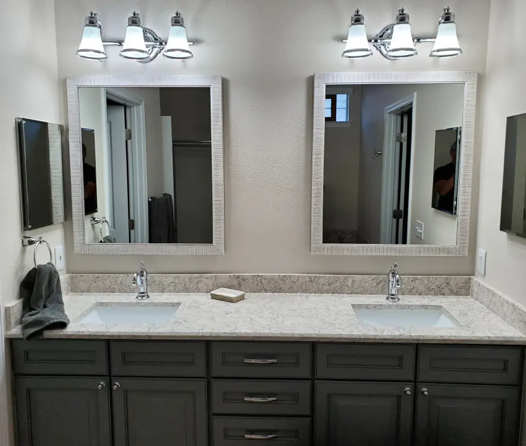 The Huntington framed mirror would look right at home in a beach house or a farmhouse. The rustic finish features scored lines that run perpendicular to the frame edge to take this custom design from simple to spectacular.Hangrail for installation will be applied on the width of the frame. All assembly hardware and instructions will be included. Additional hangrails are included if the opposite orientation is desired for installation. The dimensions displayed are the final outside dimensions of the frame, including the mirror. CATII safety backing applied on all mirrors. Approved for high-moisture areas such as bathrooms.