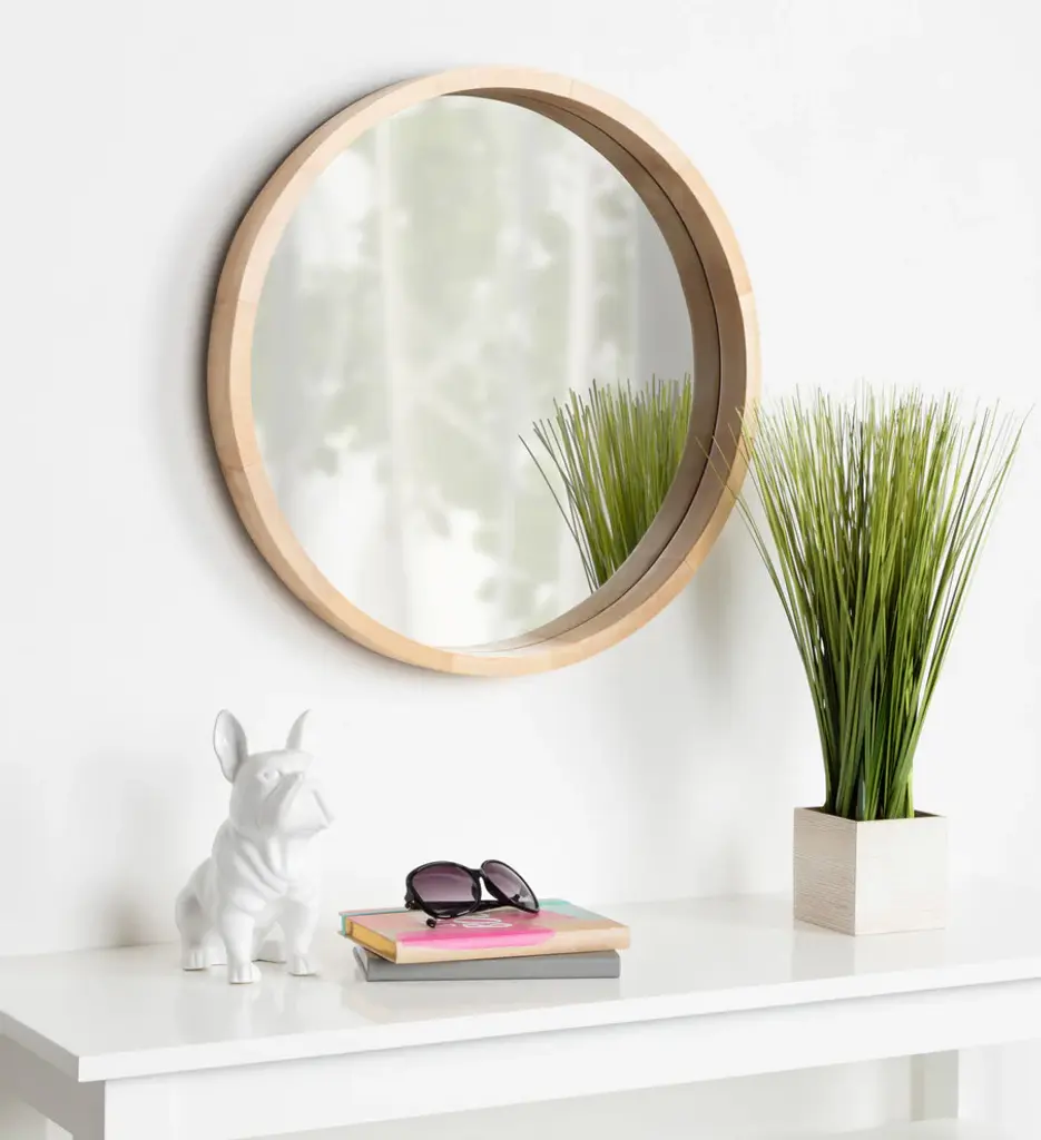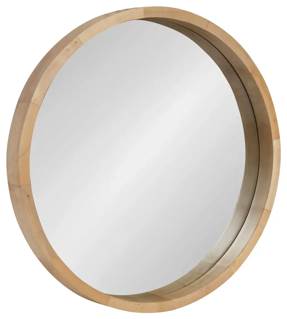 With the round shape, light natural finish and Scandinavian aesthetic of the Kate and Laurel - Hutton Mirror, function never looked so fashionable. This mirror is a great way to open up space and bring lightness to any room as well as a fantastic way to add style and finesse. This smaller version of the Hutton mirror is sure to fit in with your best look, creating an eye-catching display of pure inspiration. The shape will be a great way to break up the straight lines of a gallery display or just the right size for a smaller wall space. Hang directly above a sink, making it just perfect as a simple vanity. The outside diameter of this round mirror is 22 inches x 2.0 inches deep. Two hangers come installed on the back and are elbow D-Ring type with a wire in between them, which will keep the mirror flat and secure.• With an outside frame diameter of a demure 22 inches, the sleek round shape and size of this version of the Hutton Mirror is a beautiful addition to that area of wall space that could use a touch of charm• An artistic display on its own, this mirror will be a fetching part of any home decorating scheme. The modern shape and the deep inset of the glass surrounded by the warm finish of the frame gives off even more light and depth• Two hangers come installed on the back and are elbow D-Ring type with a wire in between them, which will keep the mirror flat and secure against a wall• The Scandinavian-like style of this modern design gives this mirror a gorgeous chic feel - a look that goes with and complements most home decor• An attractively framed mirror is the affordable way to decorate your wall while bringing light and space into a room