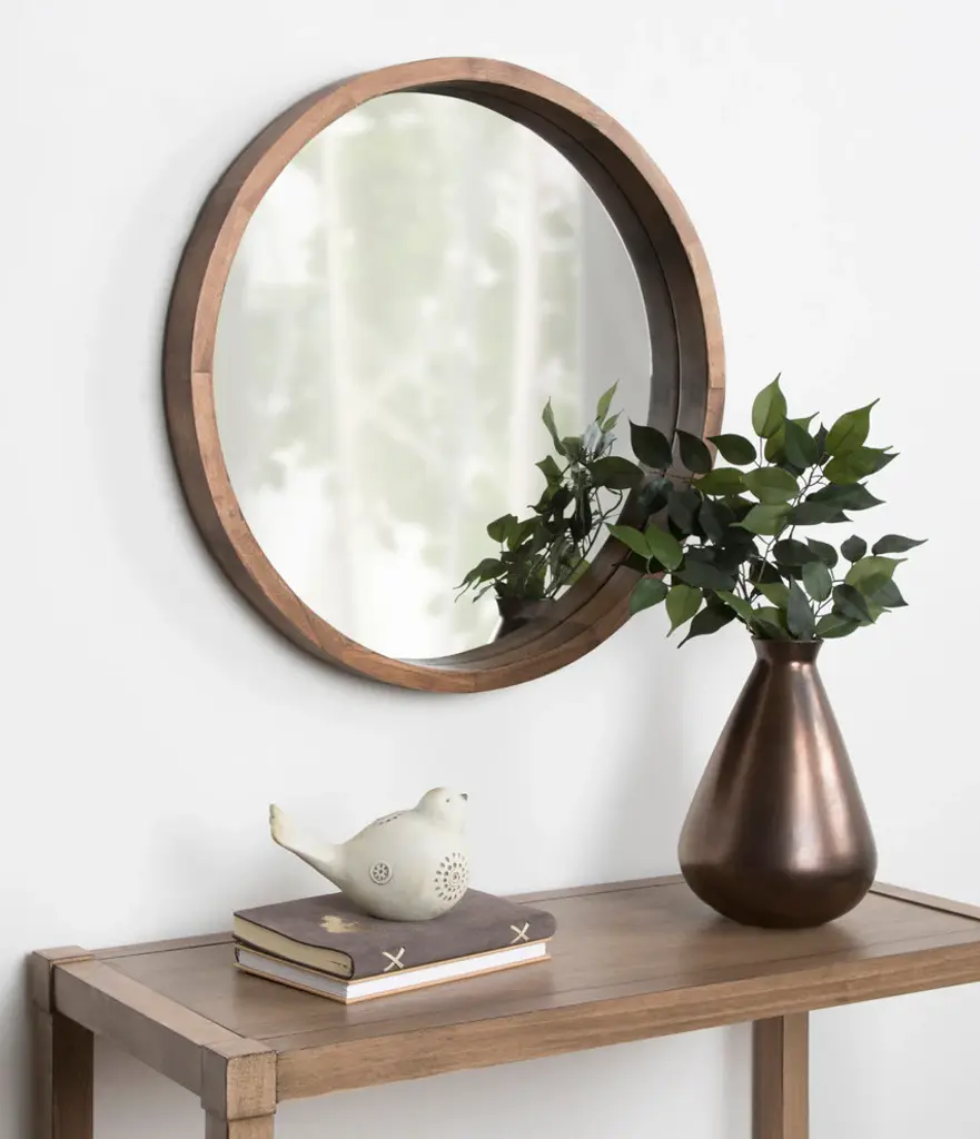 Mirrors are a great way to open up space and bring lightness to any room, but beyond that, they are a fantastic way to add style and finesse as well. Not only can they be used as a much-needed accessory and fun to decorate with, but with a bit of imagination, they can become a real focal point of your home. With the round shape of the Kate and Laurel - Hutton Mirror, function never looked so fashionable. The gorgeous wood frame has a smooth, sturdy appearance creating a modern take on an art deco design. This smaller version of the Hutton mirror is sure to fit in with your best look, creating an eye-catching display of pure inspiration. The shape will be a great way to break up the straight lines of a gallery display or just the right size for a smaller wall space. Hang directly above a sink, making it just perfect as a simple vanity. The outside diameter of this round mirror is 22 inches x 2.0 inches deep. Two hangers come installed on the back and are elbow D-Ring type with a wire in between them, which will keep the mirror flat and secure.• Round Farmhouse Mirror: With an outside frame diameter of a demure 22 inches, the sleek round shape and size of this version of the Hutton Mirror is a beautiful addition to that area of wall space that could use a touch of charm• Quality Round Wood Mirror: An artistic display on its own, this mirror will be a fetching part of any home decorating scheme. The modern shape and the deep inset of the glass surrounded by the warm finish of the frame gives off even more light and depth• Easy to Hang: Two D-ring hangers come installed on the back of this round wall mirror with a wire between them, which will keep the mirror flat and secure against a wall• Circle Mirror for Wall Decor: The art deco style of this modern design gives this mirror a gorgeous chic feel - a look that goes with and complements most home decor• Round Mirrors for Wall Decor: An attractively framed mirror is the affordable way to decorate your wall while bringing light and space into a room