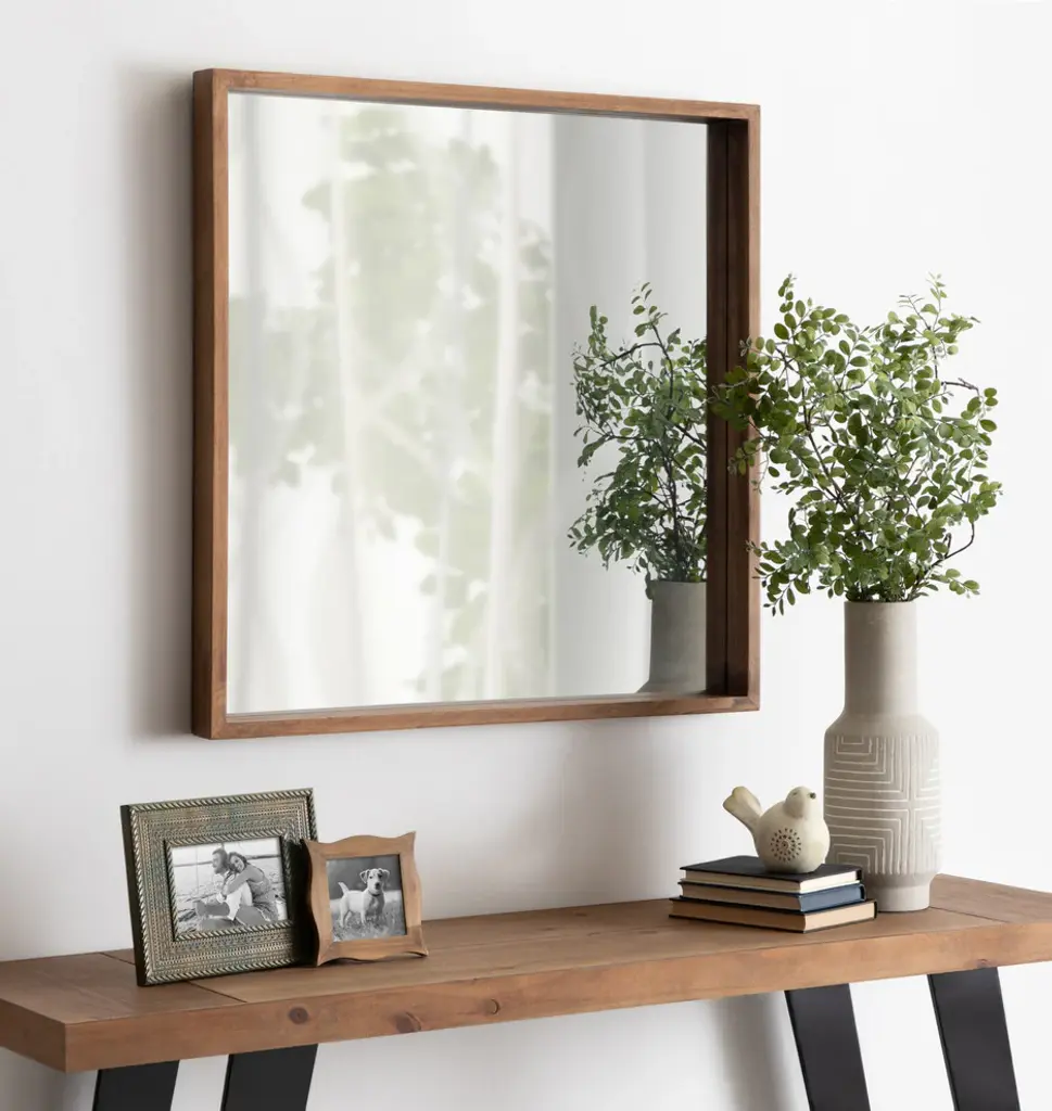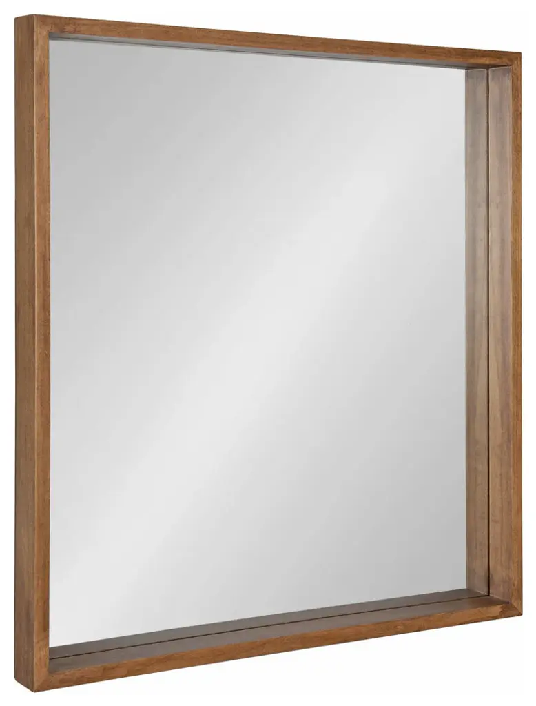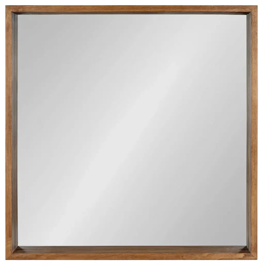 There''s no better way to open up your space than adding an oversized accent mirror. Mirrors reflect light throughout your rooms and add depth and dimension. The Hutton collection of mirrors is a decadent selection of geometric mirrors with rustic farmhouse charm. Each Hutton Mirror includes a solid wood frame with a beautiful natural finish, creating a smooth, sturdy inspired by art deco design. It also has a two-inch depth for an eye-catching, dynamic profile and shelving opportunity. The Hutton Square mirror has an ample size of 30 inches high by 30 inches wide. This generous sizing makes it a grand statement to hang above the mantle, over an entryway console, or in the bedroom to spread a little more light. You can even hang it over your sink for a rustic bathroom mirror for your vanity. The actual mirror within the frame is 28.5 inches high by 28.5 inches wide. The square mirror comes fully assembled, so it only takes a matter of minutes to mount it to the wall with the metal D-Ring hangers and included hardware.• OVERSIZED MIRROR: The Hutton Mirror in frame is 30 inches high by 30 inches wide, making it a great symmetrical accent piece for your mantle or bathroom vanity• NO ASSEMBLY REQUIRED: This mirror ships flat with no complicated instructions or multiple pieces• EASY TO MOUNT: The Hutton hangs in seconds with all hardware included and metal D-Ring hangers• MODERN FARMHOUSE STYLE: An artistic display on its own, this mirror will be a striking part of any home decorating scheme. The modern shape and the deep inset of the glass surrounded by the rich finish of the frame gives off even more light and depth• FUNCTIONAL IN ANY ROOM: Hang it in your living room, bedroom, entryway, or dining room for an extra rustic flare to your living space
