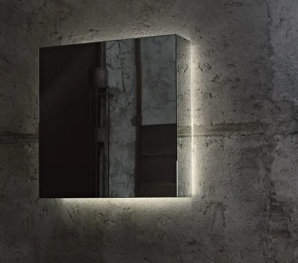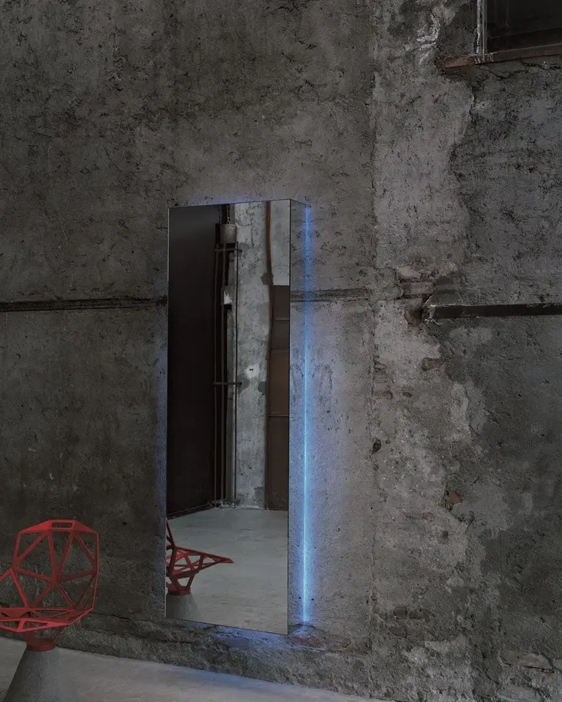 I Massi is a parallelepipeds obtained by gluing 45° chamfered mirror slabs, so as to get a monolithic figure. In the version with lighting installation with white or blue neon, a circle of light pours out from the back of the mirror. It is also available without lighting. Supplied with double horizontal and vertical fixture.Attention, to avoid that the cleaning detergent seeps between the mirror slabs causing the oxidation of this one, it is recommended not to spray it directly on the mirror but to dampen the cloth used.