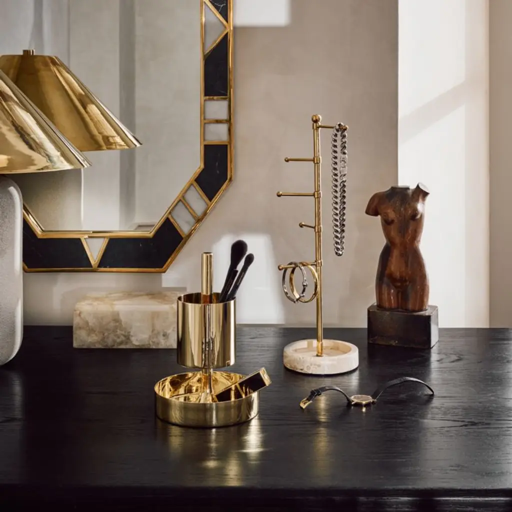 Clean geometry and decadent materiality converge in wall mirror by award-winning designer Silvana Azzi Heras of House of Heras. Unlacquered brass frame holds inlays of Marquina black marble and Carrara white marble aswirl with unique veining; due to the inherent variation of natural stone, no two mirrors will be exactly alike. Mirror may be hung horizontally or vertically. CB2 exclusive.