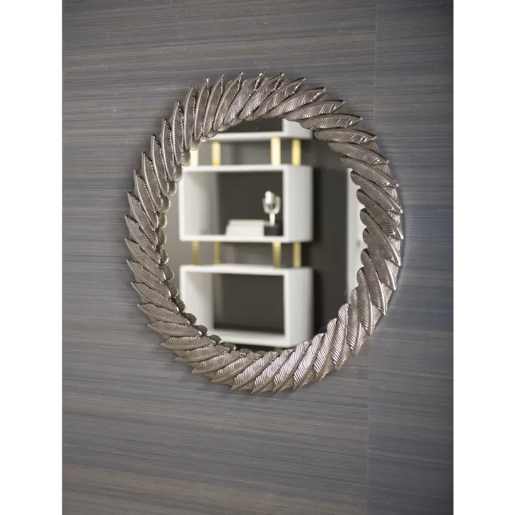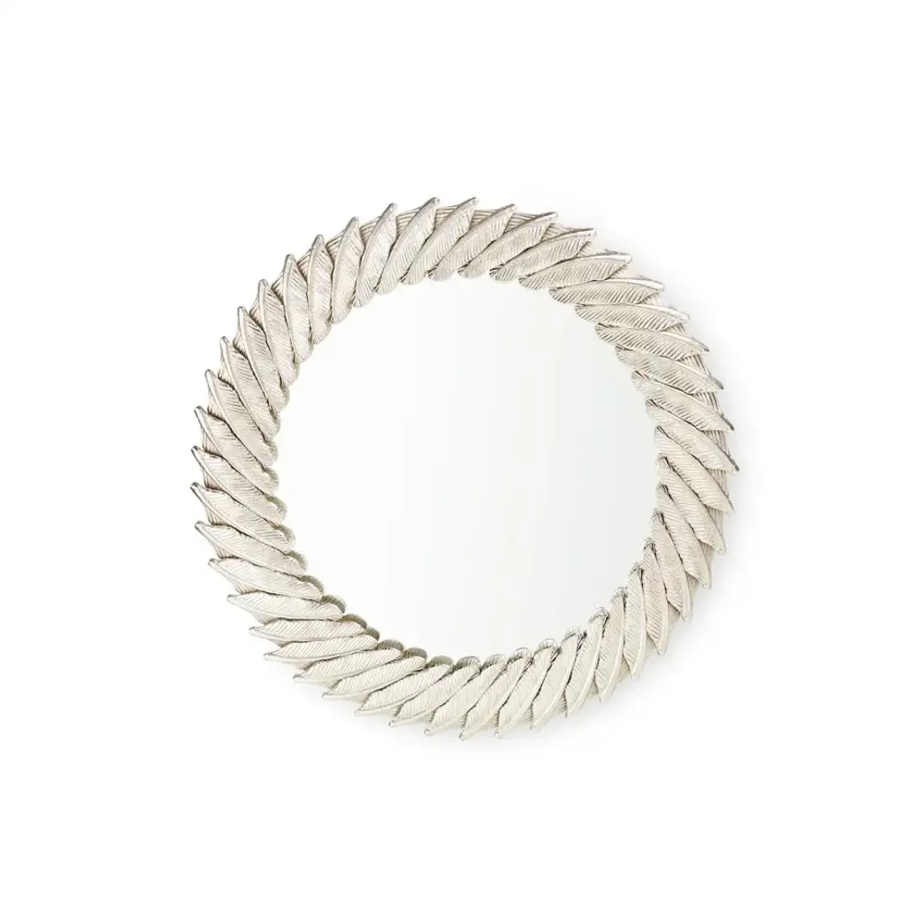 Feather Border Brass or Nickel Round Mirror, Icarus Collection The Icarus Mirror Collection, a close cousin to our Europa Collection, is artisanal, with a layered feather motif that creates a whimsical and stylish frame. The wall mirror's metal base is sand-casted by hand, a process that uses molds made of sand to accurately replicate a designer's intended form with sharpness and specificity, and is finished in brass or nickel. The name Icarus is derived from Greek mythology, where Icarus and his father attempt to escape from Crete with wings constructed of feathers and wax. The size—bigger than our other sand cast mirrors—can be used in a powder room, above a chic vanity, mounting above a desk, or hung on a gallery wall in concert with other art and mirrors. The Icarus decorative wall mirror is designed to complement our Ganymede Mirror perfectly, too. Please note that there are D-rings installed for ease of hanging. What We Love About the Icarus Mirror: The Icarus Mirror's leaf pattern is reminiscent of Ancient Rome and recalls organic, natural shapes in an elevated, glamourous way. Its dominant size allows the piece to stand on its own.